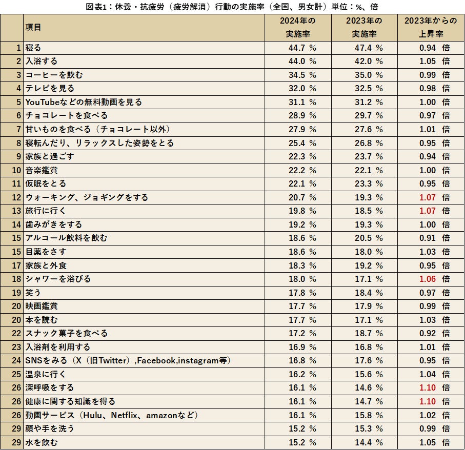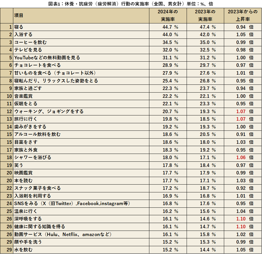 2024年の休養・抗疲労行動の実施率TOP30を見ると、1 位「寝る」44.7%、2位「入浴する」44.0%、3位「コーヒーを飲む」34.5%、4位「テレビを見る」32.0%、5位「YouTubeなどの無料動画を見る」31.1%となり、上位は2023年と全く変わらない順位となりました。上位の中で、2023年からの上昇率が高いのは「深呼吸をする」、「健康に関する知識を得る」が1.10倍、「ウォーキング、ジョギングをする」、「旅行に行く」が1.07倍、「シャワーを浴びる」が1.06倍となりました。深呼吸や旅行など、今注目されているリトリートに関わるものが上昇しています。また、健康に関わる知識を得ることが抗疲労行動として取り入れられるなど、休養・抗疲労へ関心が高まっていることが分かりました。