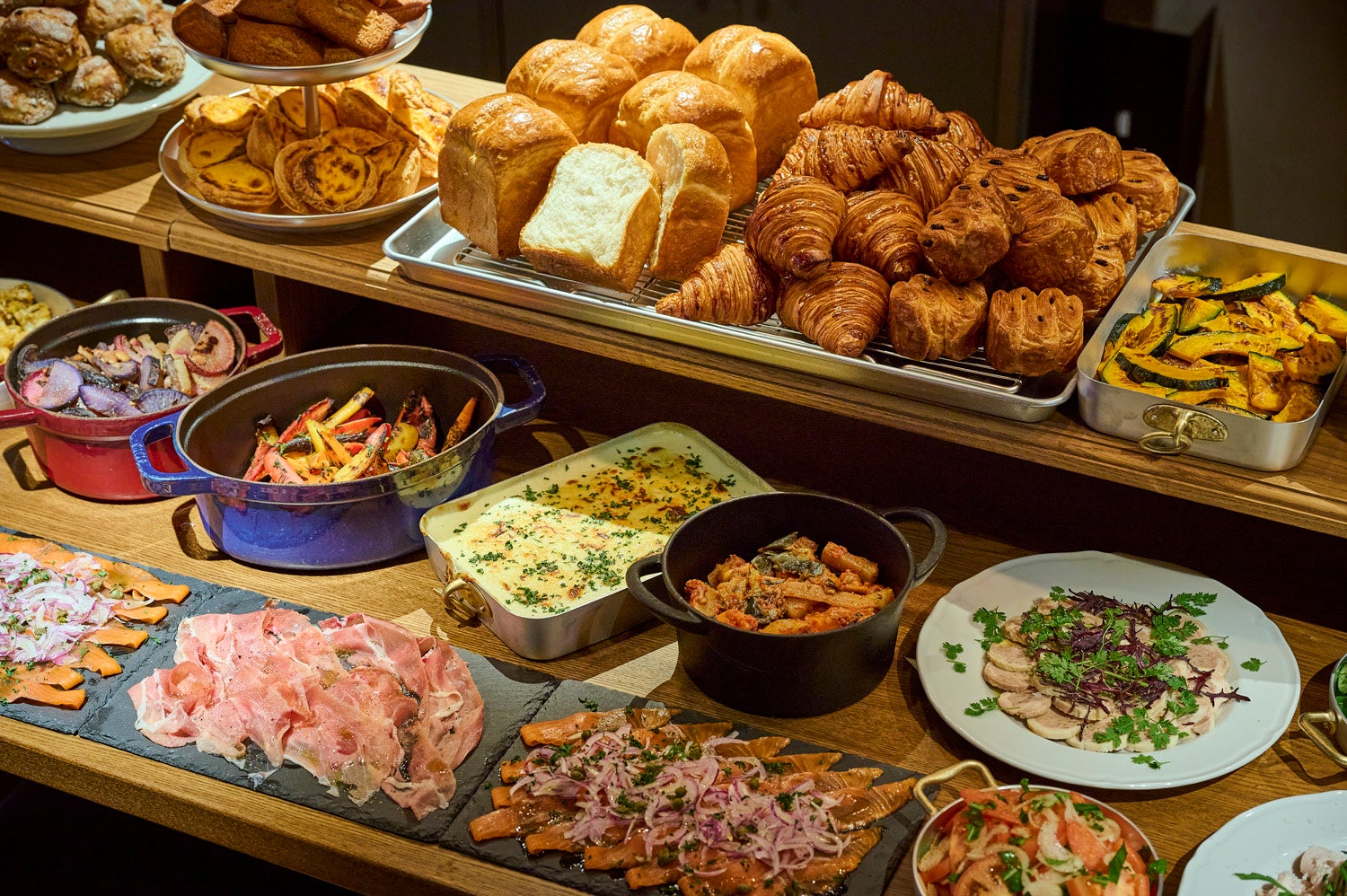 栃木県産の野菜や卵、LAZULI BAKERYの焼きたてパンを中心にしたブッフェスタイルの朝食。