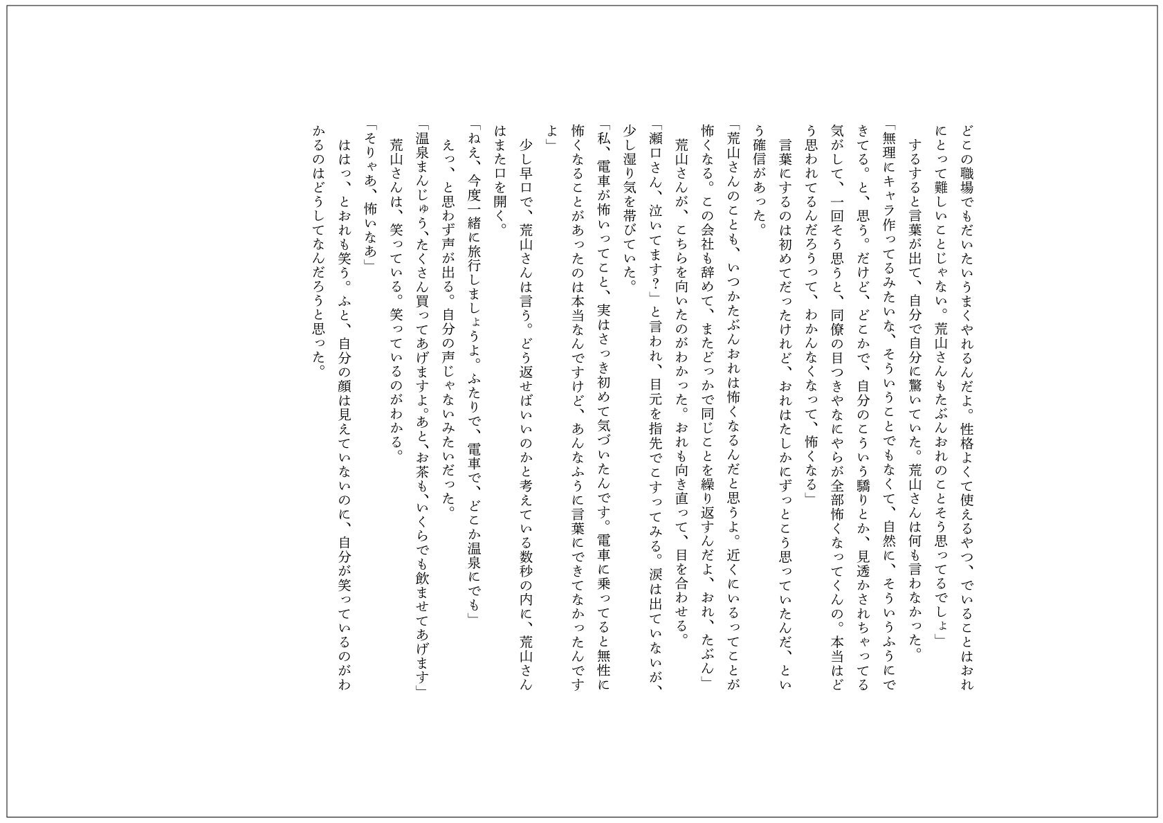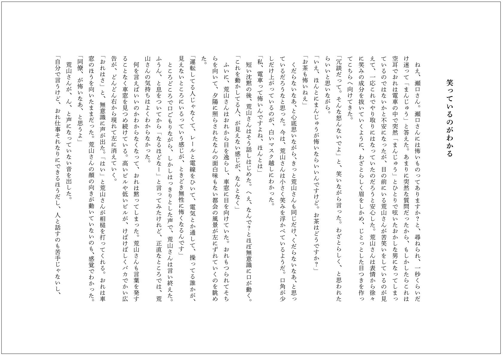怖いものを伝えることは、多少なりとも勇気のいることです。自分の在り方、根幹にかかわる大切なことを吐露した後の、「ねえ、今度一緒に旅行しましょうよ。」という唐突さ。軽快な会話に見えますが、瀬口さんの怖さを荒山さんがやすやすと飛び越えた瞬間を捉えているところ、これまで自他ともに表情を気にしていた瀬口さんが自然と笑うという締め方に希望を感じました。
