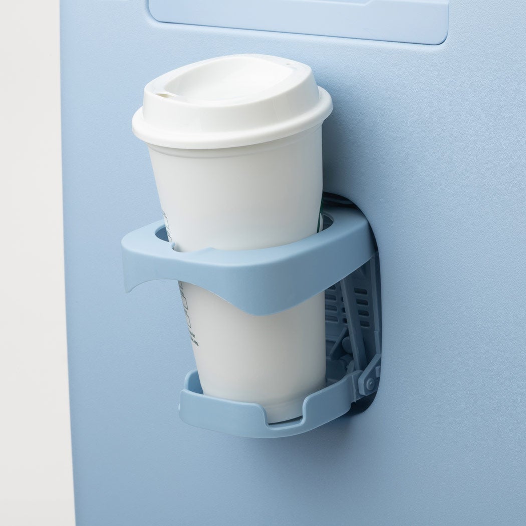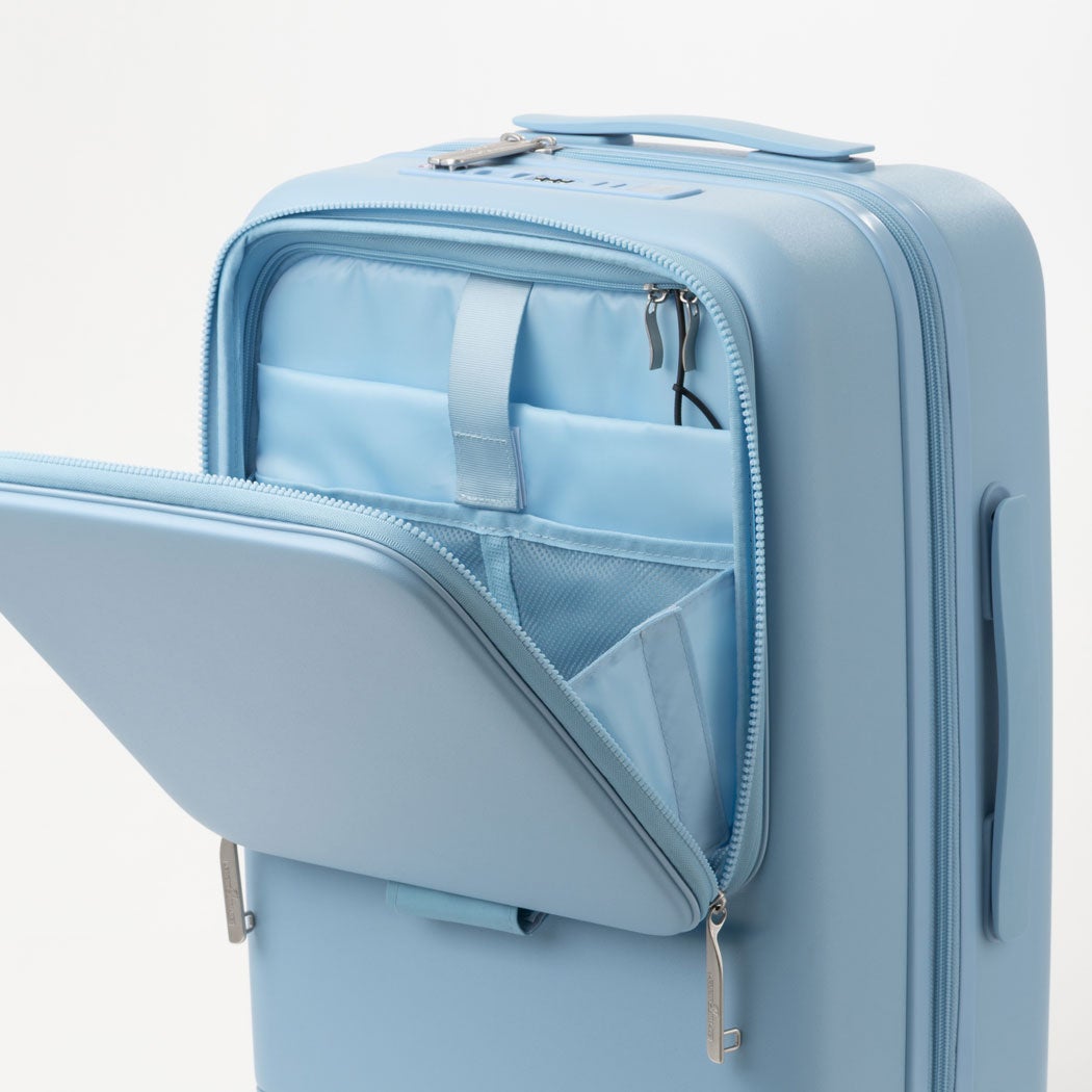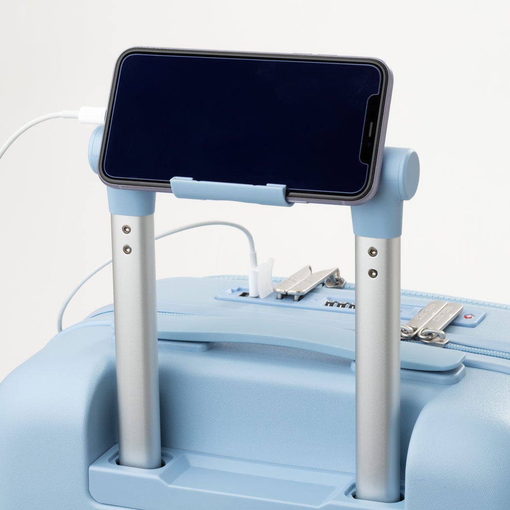 このフロントオープン部は、ポケット内のPCやパンフレットをスムーズに出し入れできるよう縦開きに。外装にはスマホスタンド&フック機能付きキャリーバー、ドリンクや“推しぬい”を入れられるドリンクホルダー、ちょっとした荷物を掛けられるフック機能付き台座を備えているほか、本体表面はステッカーが貼りやすくキズが目立ちにくいマット仕上げにしました。キャスターはストッパー付きで、電車内や待機中でも荷物が転がる心配がありません。さらにメイン収納内にはペンライトなどを固定できるゴム製モールも備えるなど、推し活にも普段の旅にも便利な機能を全体に多数搭載しています。
