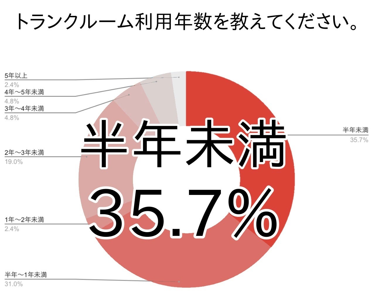 今回のアンケートではトランクルームの利用歴が1年未満の方が7割弱(66.3%)でしたが、1年以上の長期利用をしている方も3割強(33.3%)を占め、中には5年以上継続して利用している方もいらっしゃいました。
