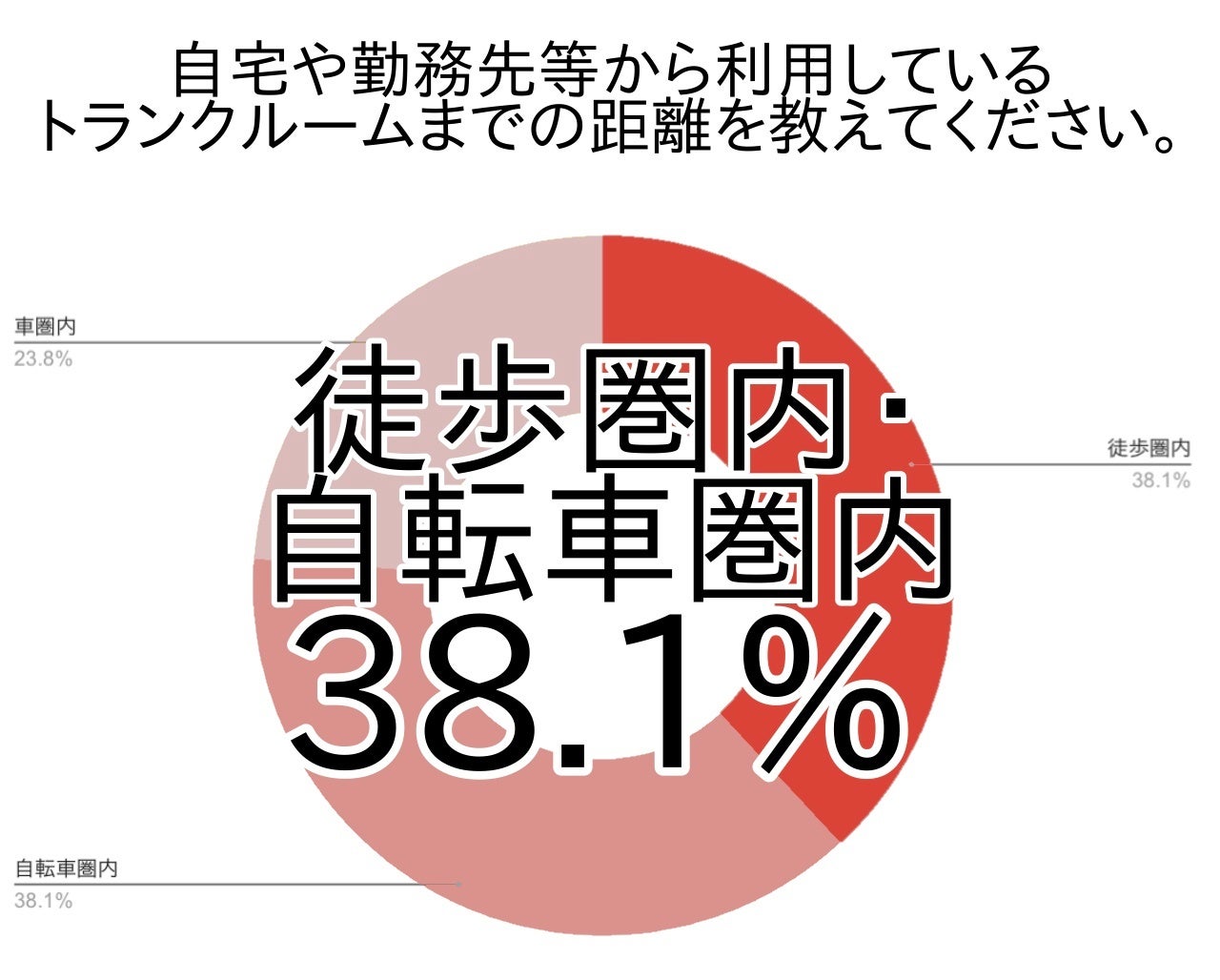アンケートでは「徒歩圏内・自転車圏内・車圏内(それぞれの交通手段で10分以内に行ける距離を圏内と定義)・それ以上」という基準で、自宅・オフィスからトランクルームまでの距離を尋ねました。