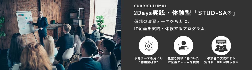 本研修はDX実現の第一歩となる自社のビジネスや業務における「課題可視化」や、ビジネスを起点とした「IT企画・立案」を実行するためのスキル習得を目的としています。
