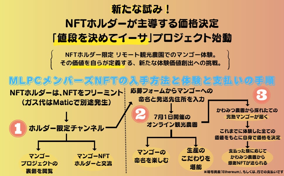このマンゴーとweb3技術が融合し、新たな体験価値を創造します。一般市場には出回らないこの特別な体験を、MLPCメンバーズNFTホルダー限定で提供します。