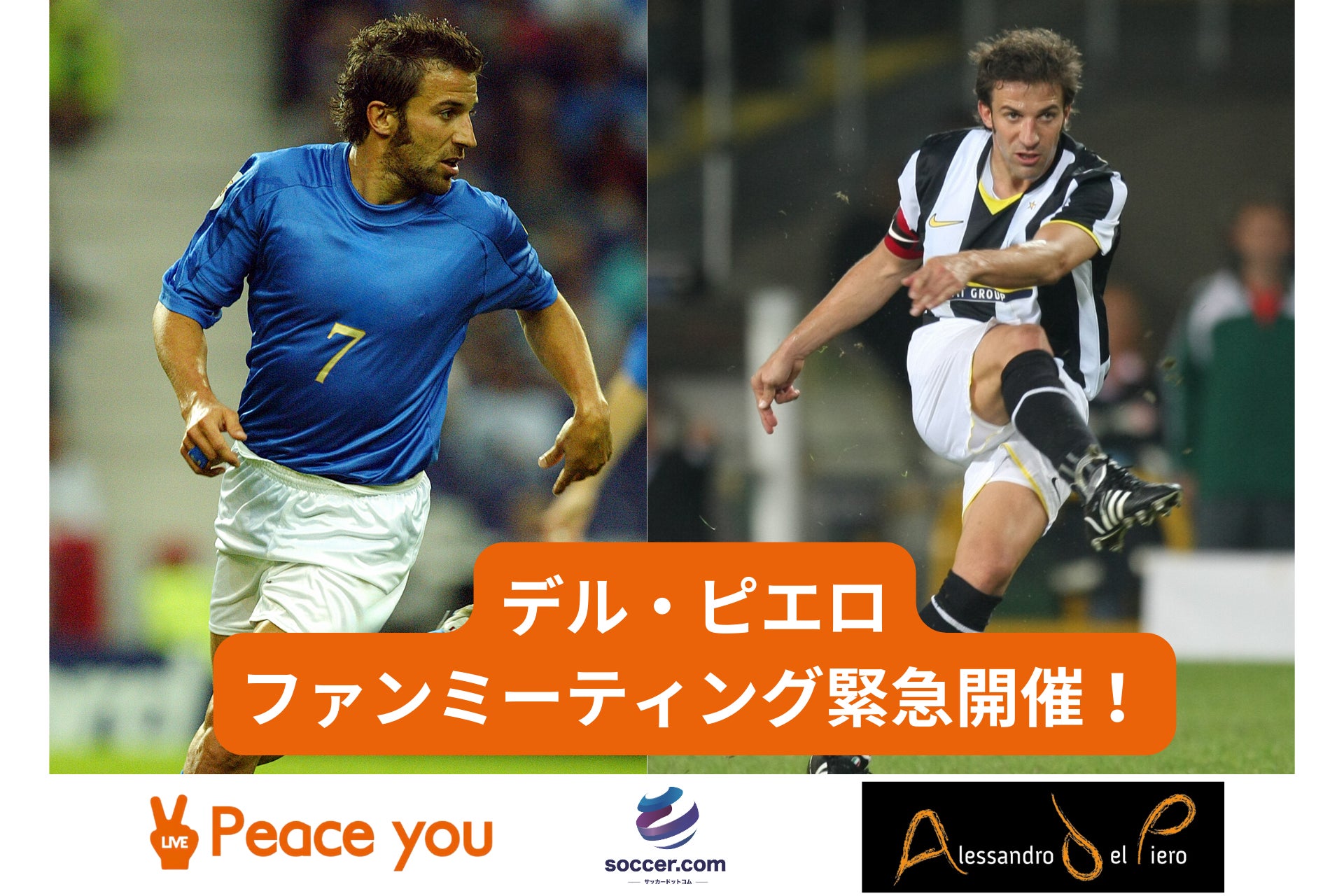 元イタリア代表のレジェンド”デル・ピエロ”氏とのファンミーティングの開催が決定いたしました。その日限りの特別なリアルイベントでは、ピースユーライブアプリのみで手に入る特別な体験をご提供予定となっております。イベント詳細、体験内容などに関しては、ピースユーライブ公式サイトやSNSで随時発表いたします。