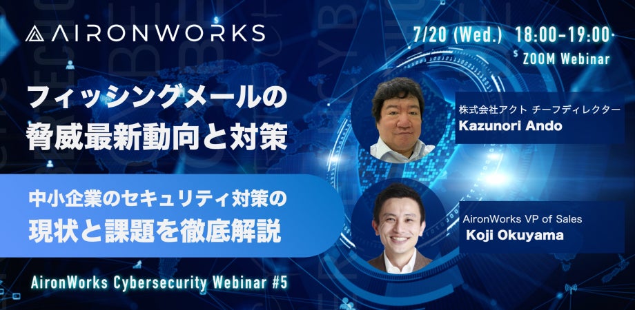 イスラエル発サイバーセキュリティSaaS提供のAironWorks株式会社 (本社:東京都港区、代表取締役:寺田 彼日、以下AironWorks)は、近年増加するフィッシング被害の最新動向やその対策について株式会社アクトのチーフディレクター、安藤様を迎え徹底解説する無料ウェビナーを7月20日(水)18時より開催することをお知らせいたします。