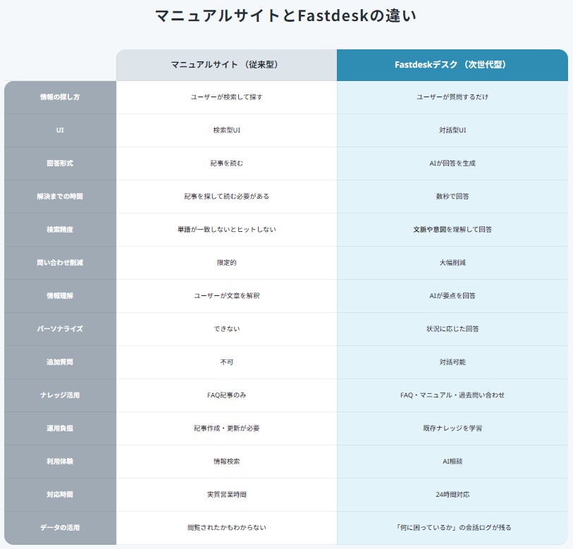 Fastdesk(ファストデスク)は、こうした従来型マニュアルサイトの限界を超え、「顧客が質問するだけで答えが返ってくる」対話型AIサポートへの転換を実現するために開発しました。