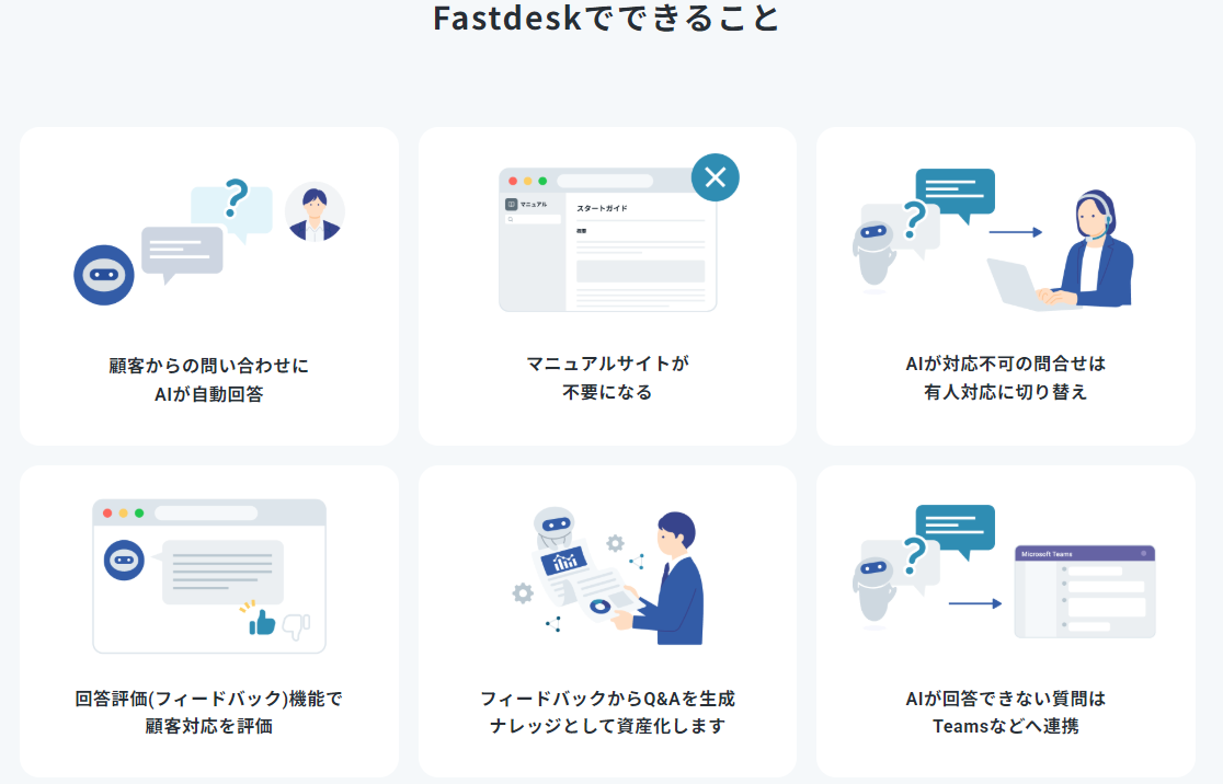 Fastdesk(ファストデスク)は、FAQ・マニュアル・過去の問い合わせ対応を学習したAIが、顧客からの問い合わせに365日24時間、即時回答するAIヘルプデスクサービスです。現状運用しているマニュアルサイトが不要となります。
