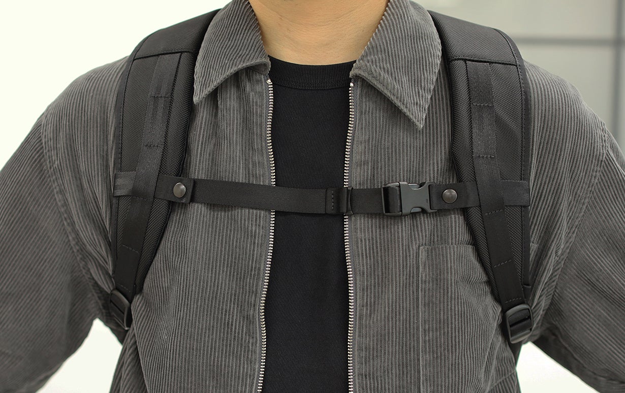 肩紐のズレ落ちを防ぎ、歩行時のバックパックのブレをしっかりとコントロール。