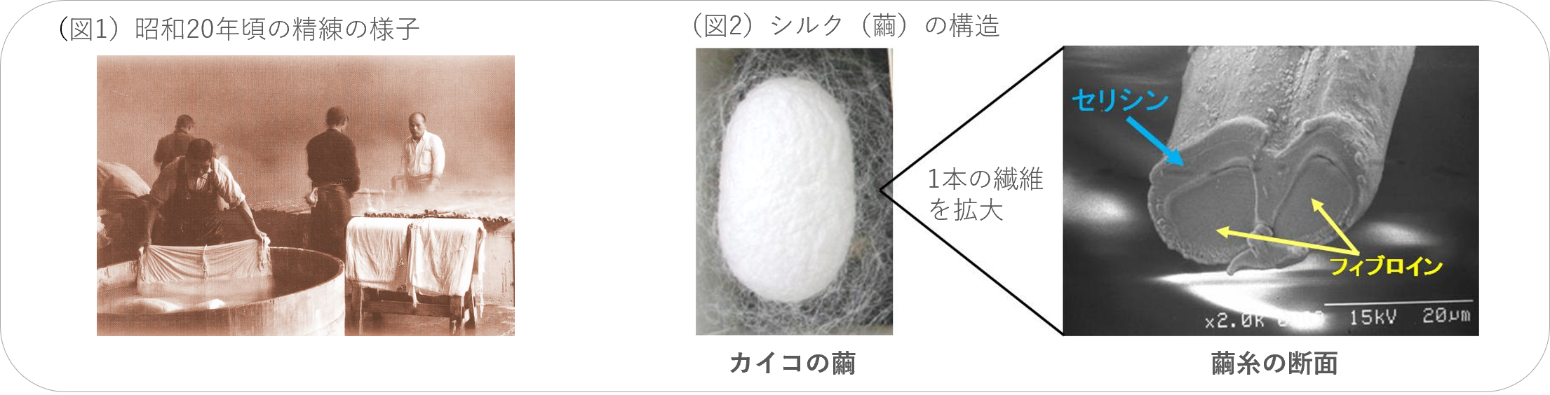総合繊維メーカー発のエイジングケア化粧品ブランドで、ピュアセリシン™を高配合しております。祖業の精練(絹織物の水洗い 図1)に携わる職人の手は、厳しい水仕事にもかかわらず、いつも白く輝いていました。当社はこの秘密が、絹に含まれるタンパク質「セリシン(図2)」であることを突き止め、「ピュアセリシンTM」を開発しました。これからもコモエースは、独自成分「ピュアセリシン™」のやさしさや多機能性を活かし、敏感肌やエイジングでお悩みの方に寄り添いながら、輝き続けられる商品づくりに真摯に取り組んでまいります。