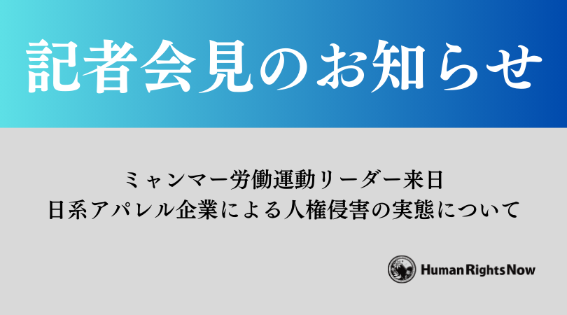 東京に本拠を置く国際人権NGOヒューマンライツ・ナウ(HRN)は、ミャンマー国内の労働運動のリーダーであるMyo Myo Aye(ミョーミョーエー)氏を招き、日系アパレル企業の海外工場における労働者の人権侵害の実態を訴える記者会見を開きます。
