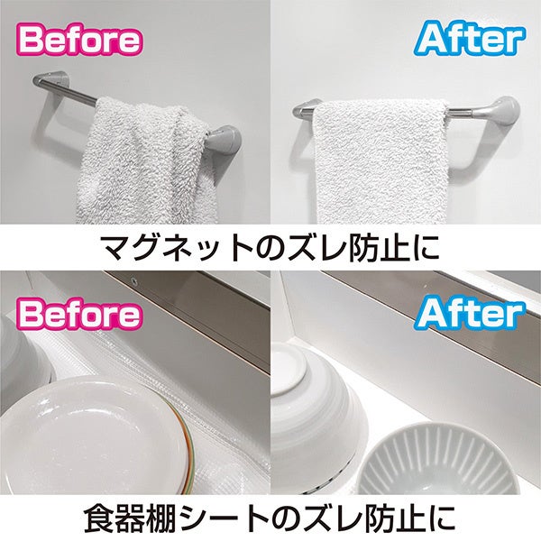 日常生活を快適にするために、フック・マット・ブックスタンドなどのズレやすい・倒れやすいものの一時固定にご使用いただけるほか、リモコンホルダーやホースリール・人工植物(ガーランド)など、固定方法が限定されてきたものへの新しい固定アイテムとして活用いただけます。