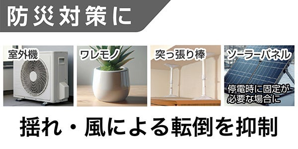 接着・ビス留め固定ができない集合住宅での室外機の固定や、災害発生後の長期停電時に活躍するポータブルソーラーパネルの転倒抑制が期待できます。