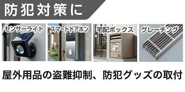 防犯グッズ (バッテリー内臓の小型センサーライト・スマートドアホン等) の取り付け固定が可能です。 屋外用品の盗難を抑制します。 好きな場所へ固定できるだけでなく、位置変更や取り換え時にはがすことが可能です。