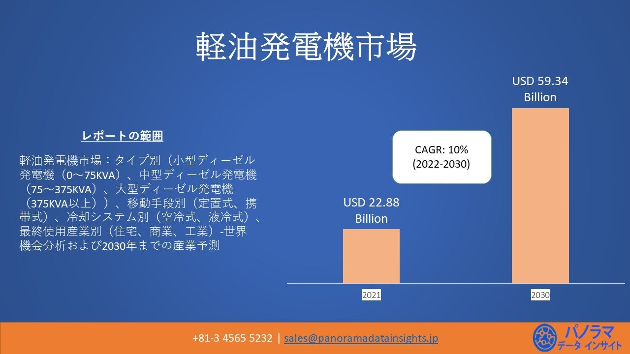 軽油発電機の世界市場規模は2021年に228.8億米ドル、2030年には593.4億米ドルに達すると予測されています.世界市場は、2022年から2030年までの予測期間において、年平均成長率(CAGR)10%で推移しています.