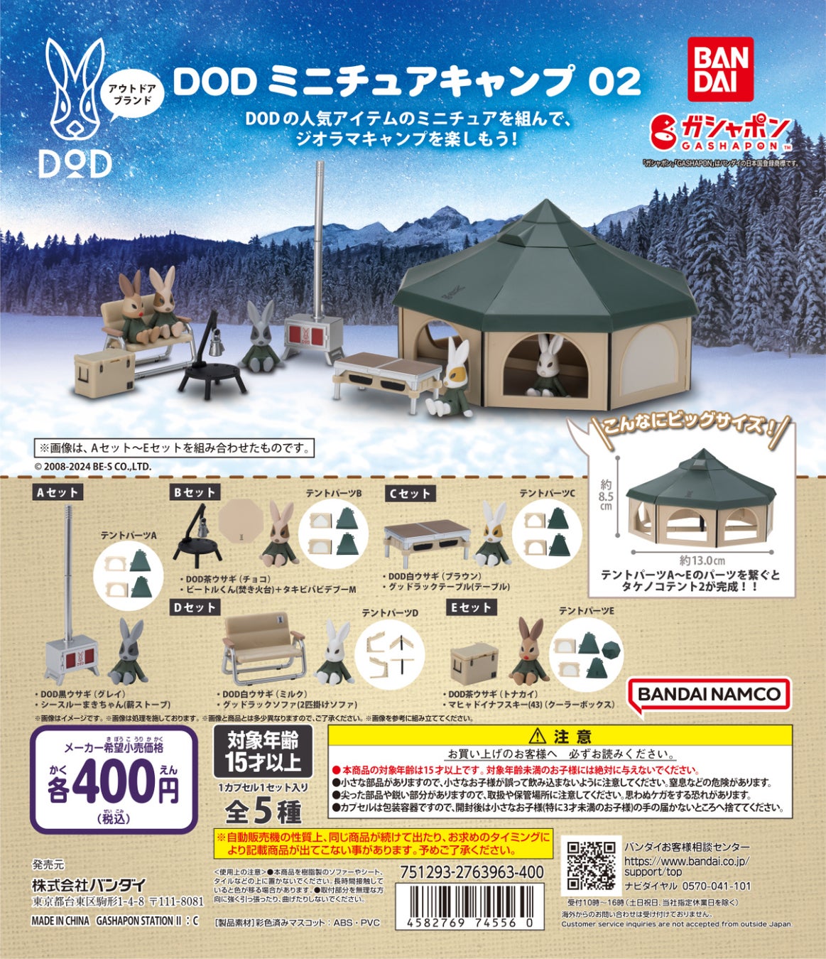 “冬キャンプ”をテーマにしたガシャポン®はA~Eの全5種、各400円。すべてのセットを揃えると、おこもりキャンプにピッタリな大型幕「タケノコテント2」が組み立てられるラインナップです。