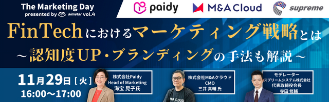 スプリームシステム株式会社、株式会社Paidy・株式会社M&Aクラウドの2社のマーケティング責任者登壇のマーケティングウェビナーを開催(2022年11月29日)