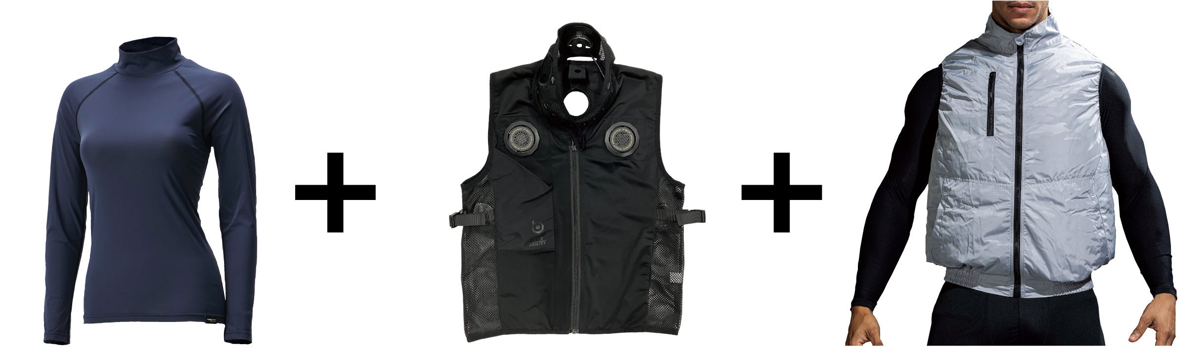 COOL EVOシリーズは、近年注目されているペルチェウェアやファン付きウェアのインナーとしての着用もおすすめです。