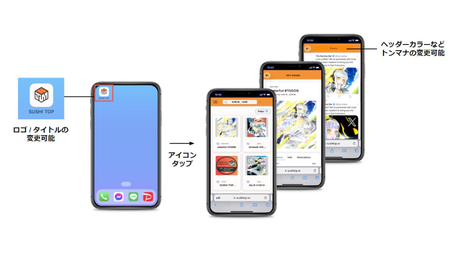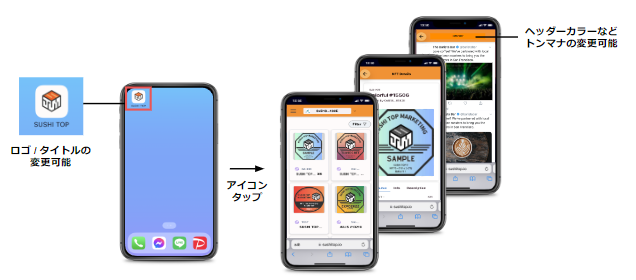 ホーム画面に表示されるアイコンのロゴやタイトル、アプリ内のページのヘッダーカラーなどをブランドイメージに合わせてお好きなように変更可能です。IPコンテンツやブランドが発行したNFTのみを表示する設定にもできるため、マイアプリをご利用いただくことで専用アプリが簡単に実装することが可能になります。