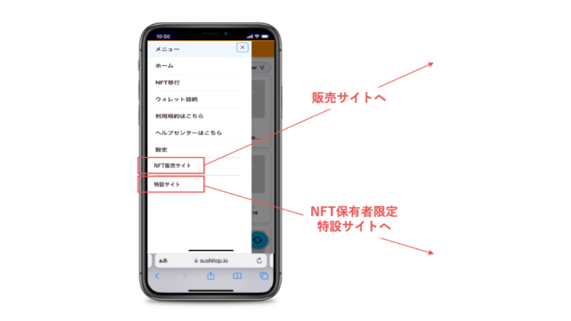 マイアプリのメニューから、特定のNFTホルダーのみが閲覧できるコンテンツを表示させたり、NFT認証が必要な限定商品の販売サイトなどと接続させることもできます。