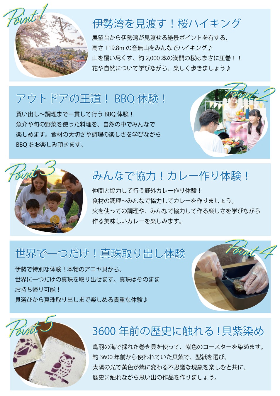 観光地巡りやモノづくり体験、さらにはBBQ体験などただの遊びではなく英語を使いながら学びを深める体験をご提供します。