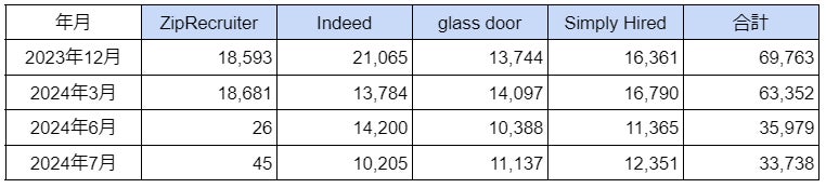 主要4サイト別の数値としては、「ZipRecruiter」が45件、「Indeed」が10,205件、「glass door」が11,137件、「Simply Hired」が12,351件となりました。
