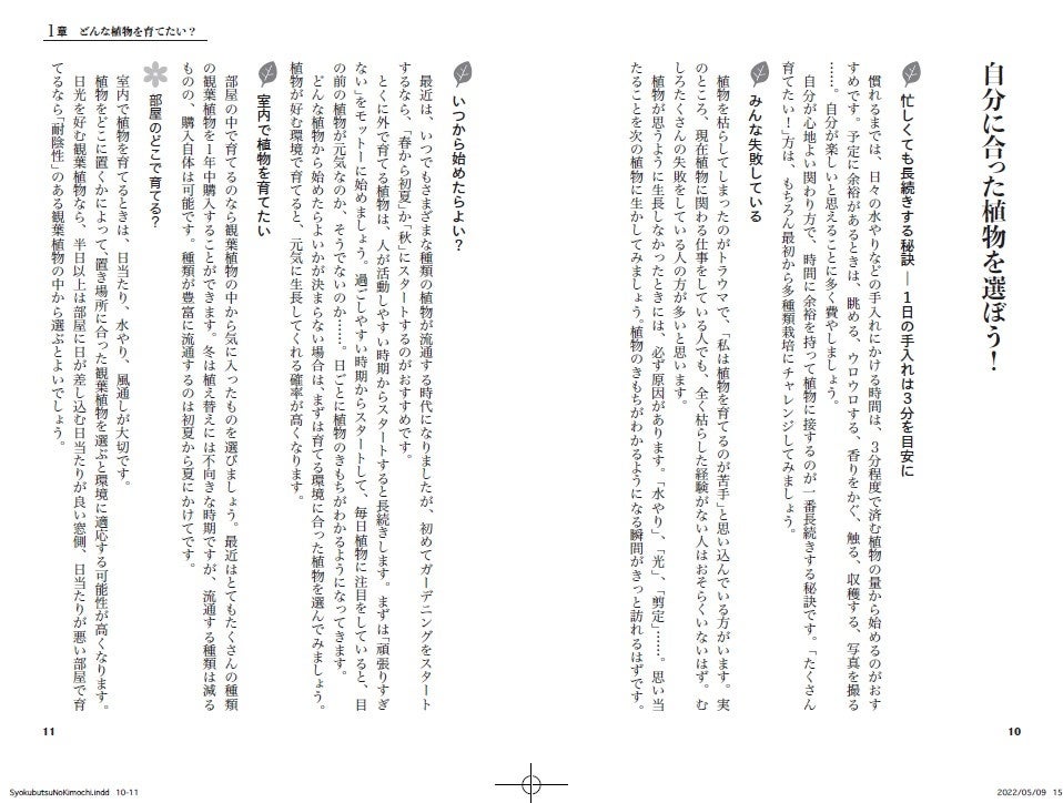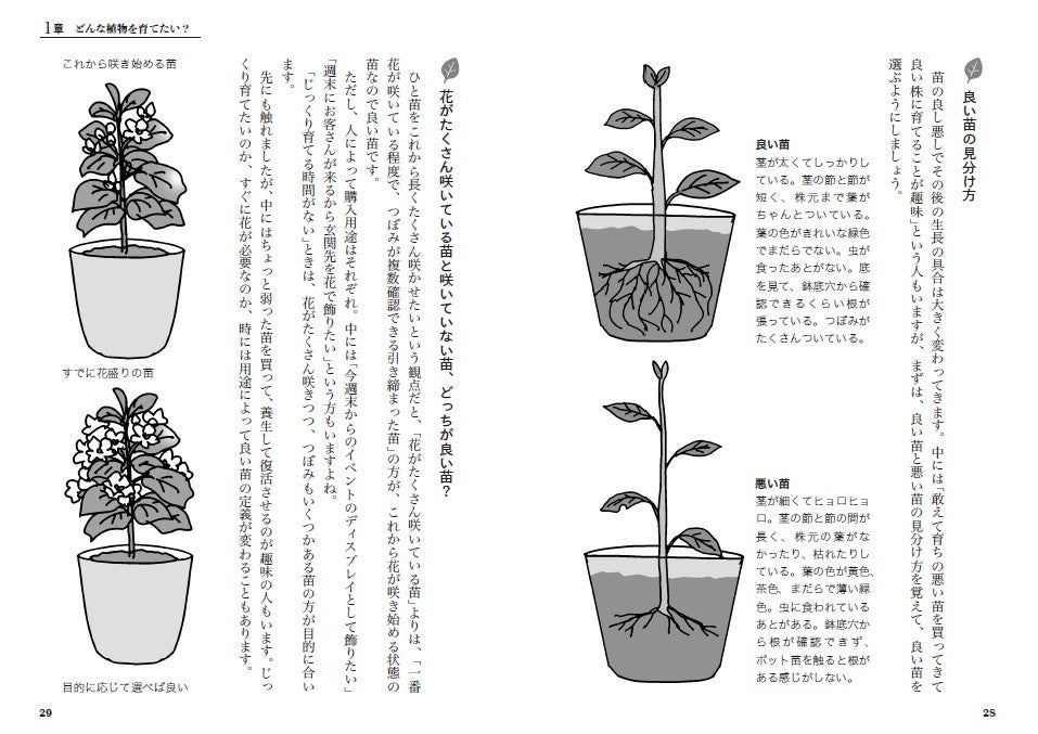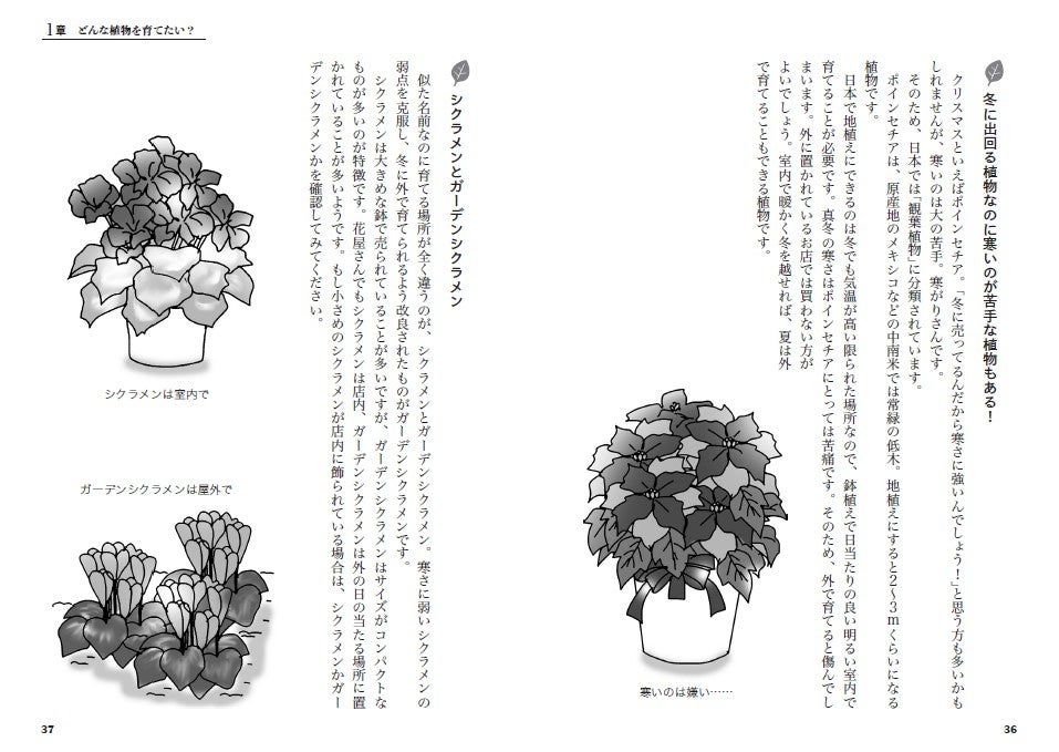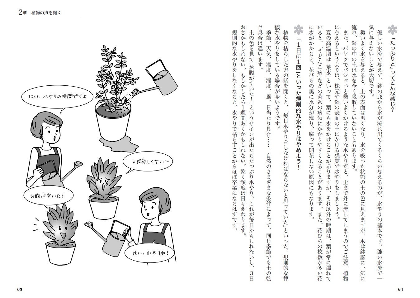 本書では現在は植物に関する記事の提案やライティングを行っているフラワーコーディネーターの金子 三保子が読者に語りかけるように植物の気持ち(育て方)を解説しています。