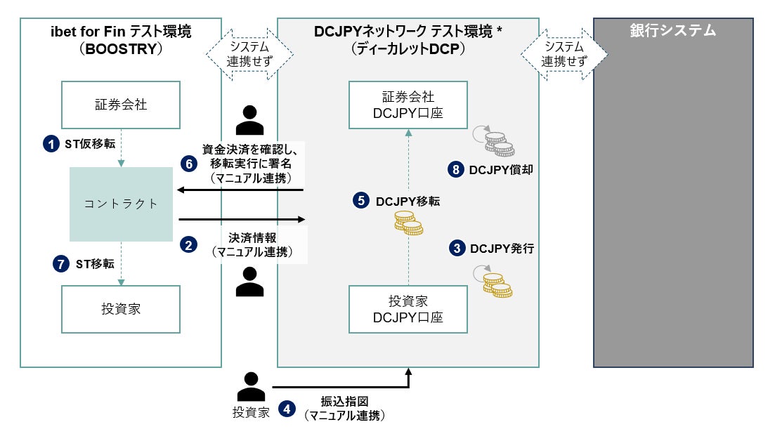 - BOOSTRYがDVP決済用に用意したシステムは、銀行口座による伝統的な法定通貨決済だけでなく、ディーカレットDCPが提供するDCJPY決済においても汎用的な利用が可能であることをテスト環境で疑似的に確認し、他の事例にも適用可能なデジタル債DVP決済の標準的スキームの一つとして立証