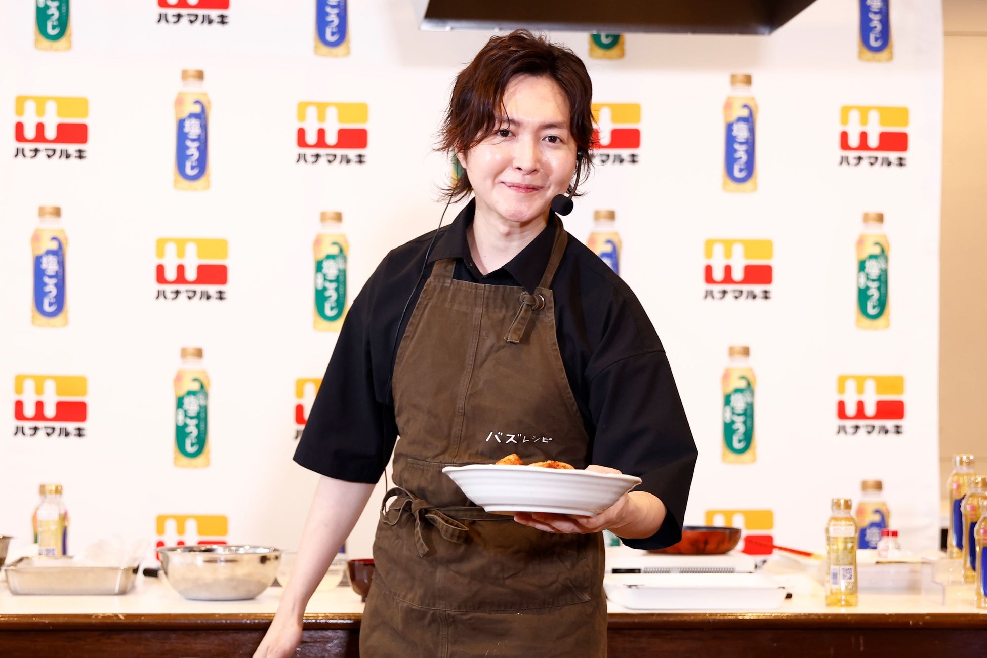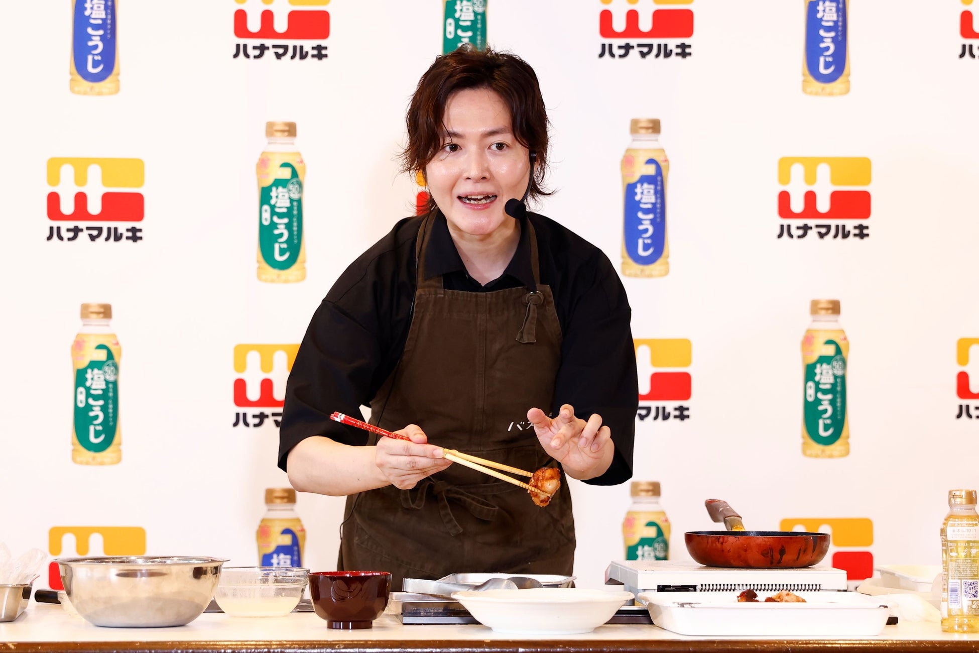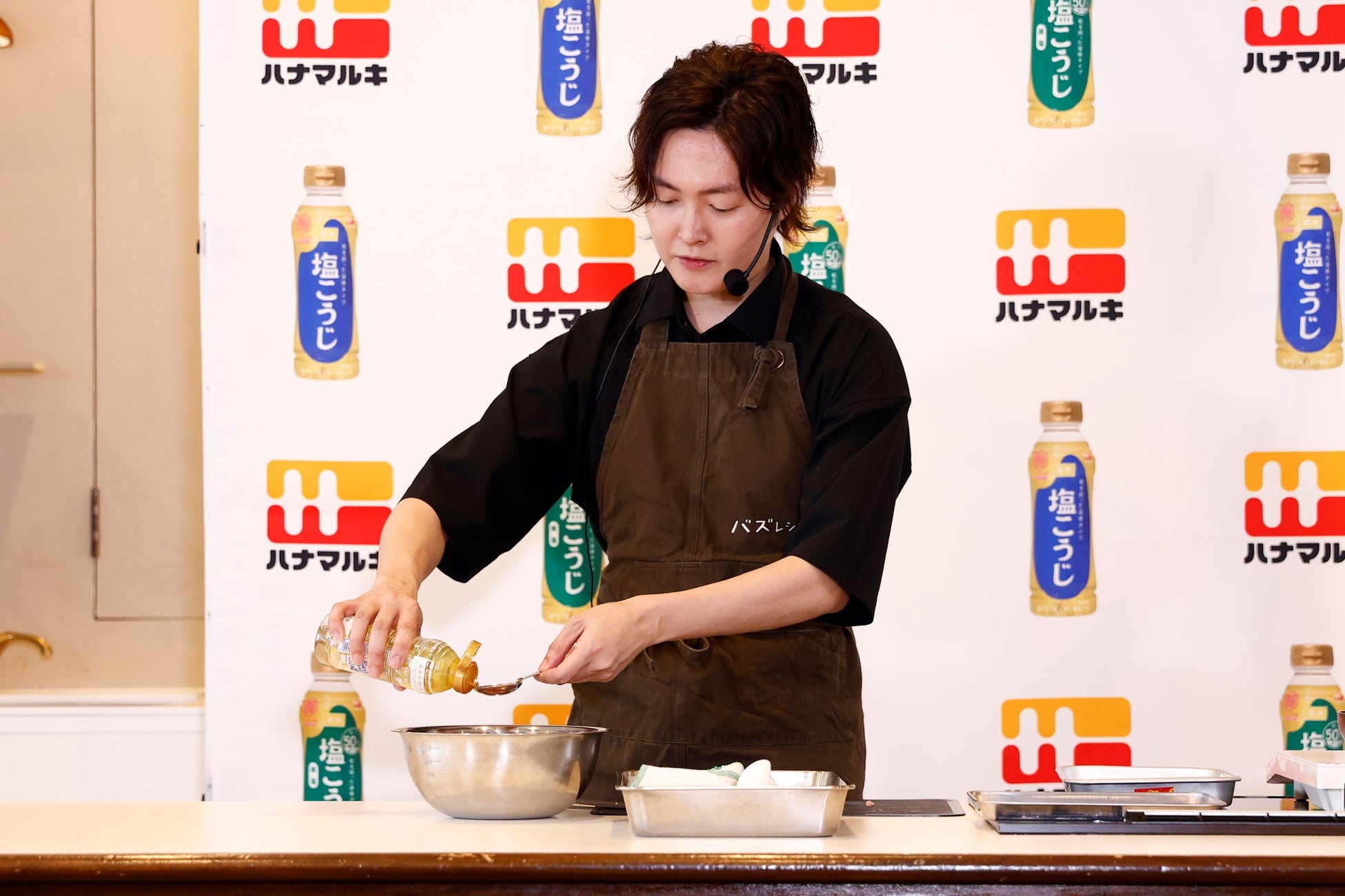 料理研究家のリュウジが9日、東京・港区のキッチンスタジオPatia東京ベイサイド店にて開催されたハナマルキの「新商品『減塩液体塩こうじ』発売記念&料理研究家リュウジさん・液体塩こうじアンバサダー就任記念イベント」に出演。報道陣の前で料理の腕前を披露した。