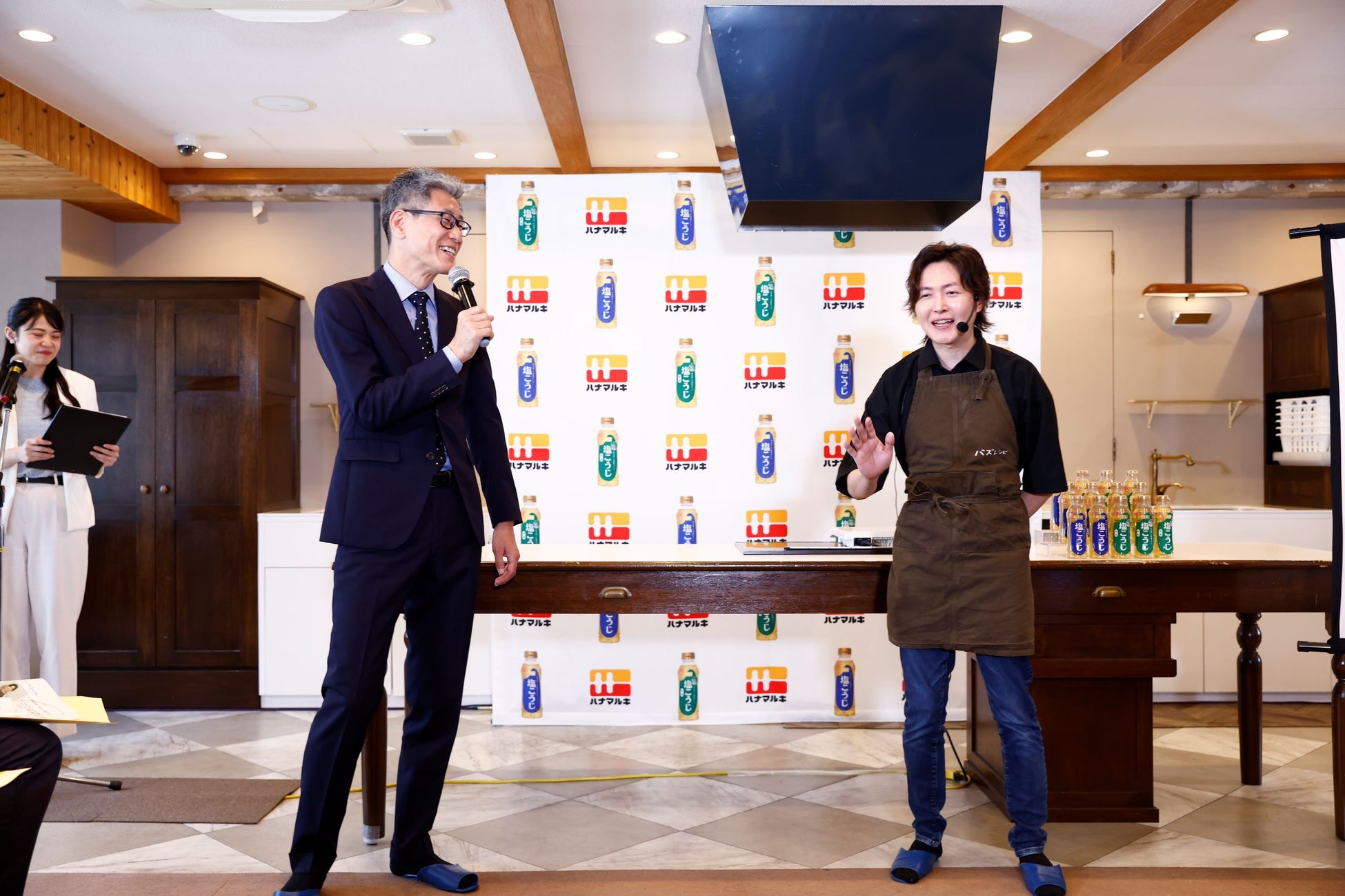 プレゼンの後、リュウジがステージに姿を現した。日頃からハナマルキ製品を愛用するリュウジは2021年に「無添加こうじみそ」のコラボ動画を公式YouTubeチャンネル「料理研究家リュウジのハズレシピ」(登録者480万人)にて公開。「料理のお兄さん」として自炊の楽しさを広めるため、多方面で活躍している。