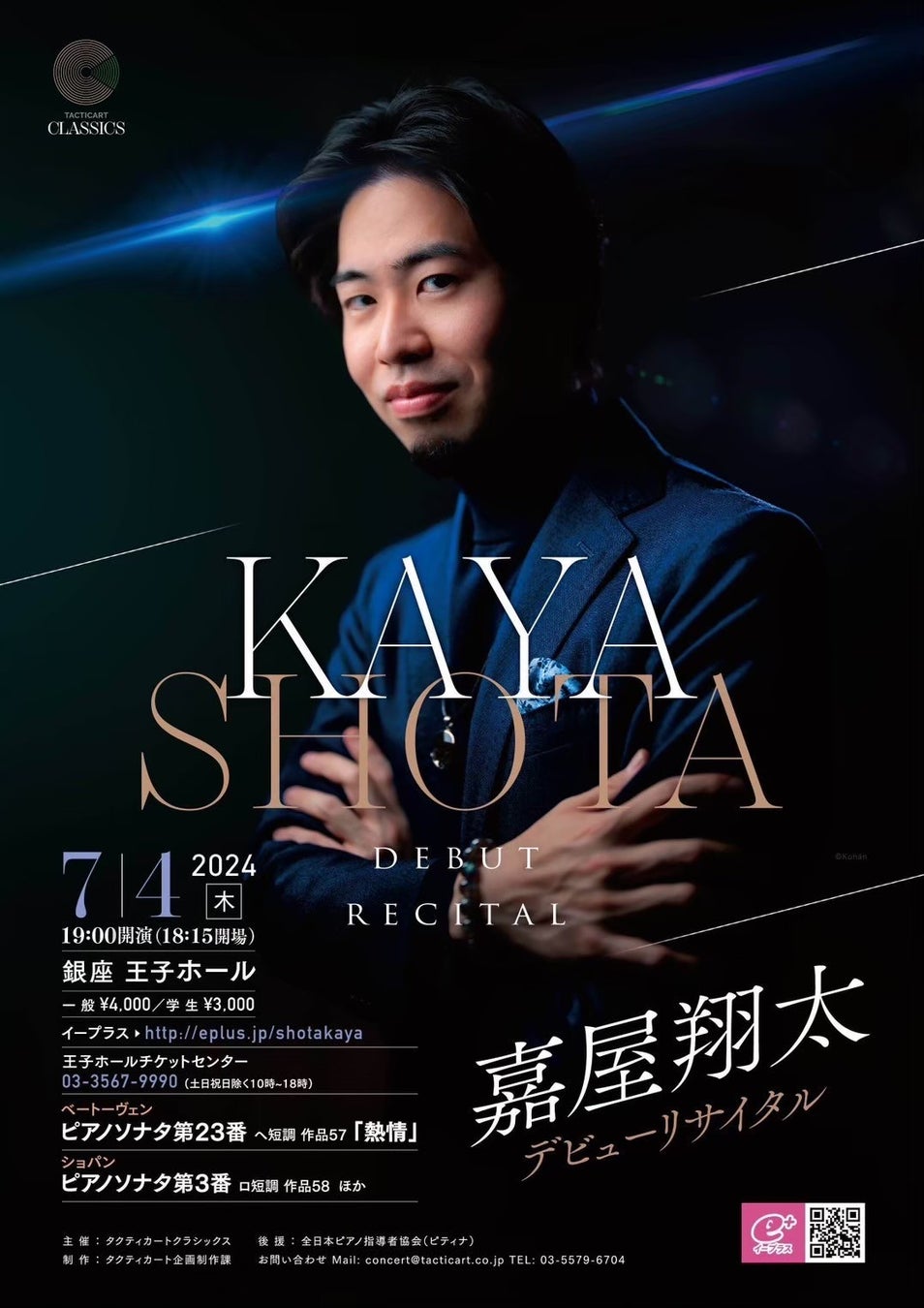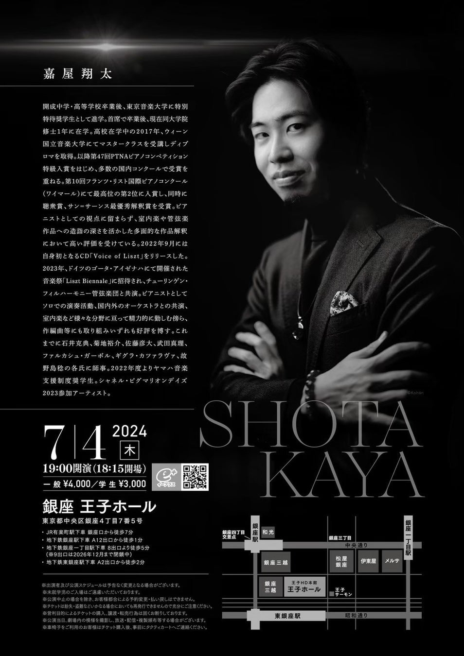 2024年7月4日(木)19時より、ピアニスト・嘉屋翔太のデビューリサイタルが銀座 王子ホールにて開催されます。第47回PTNAピアノコンペティション特級入賞をはじめ、国内外のコンクールで輝かしい実績を持つ彼が、新境地を開きます。