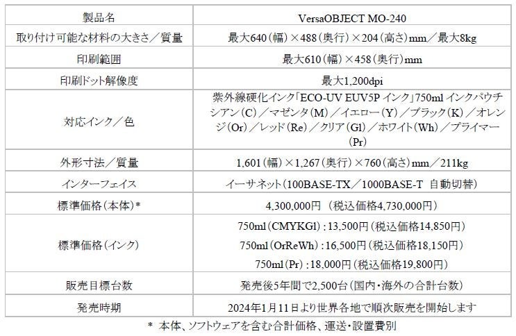 グローバルセールス&マーケティング本部 本部長 Tony Millerは「多種多様な材料に直接オンデマンド印刷ができる当社のVersaOBJECTシリーズは、その高精細で美しい表現力で、ものづくりやサービスにおける小ロット多品種生産へのニーズにお応えしてまいりました。近年では、消費者ニーズの多様化や個性化を背景に、さまざまな分野において、カスタマイズやパーソナライズといった新しいサービスが大きな注目を集めており、進化した生産性を持つMO-240は、こうしたビジネスを展開しているお客様に高い競争力をもたらすことでしょう。