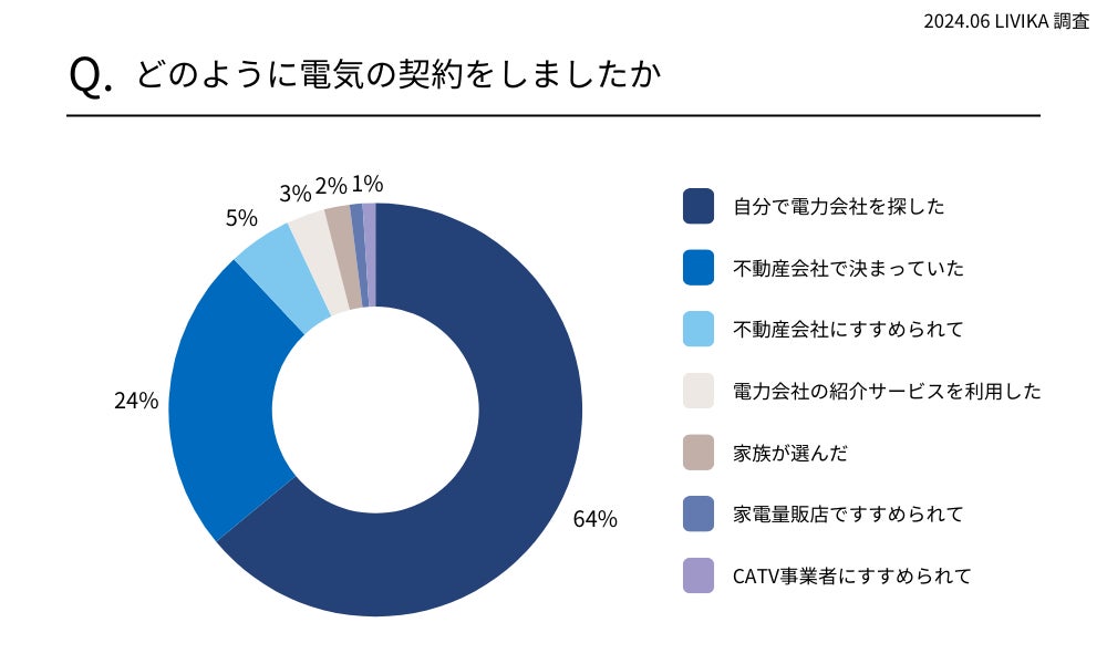 電力会社の契約で最も多かったのは「自分で電力会社を探した」で64%となりました。