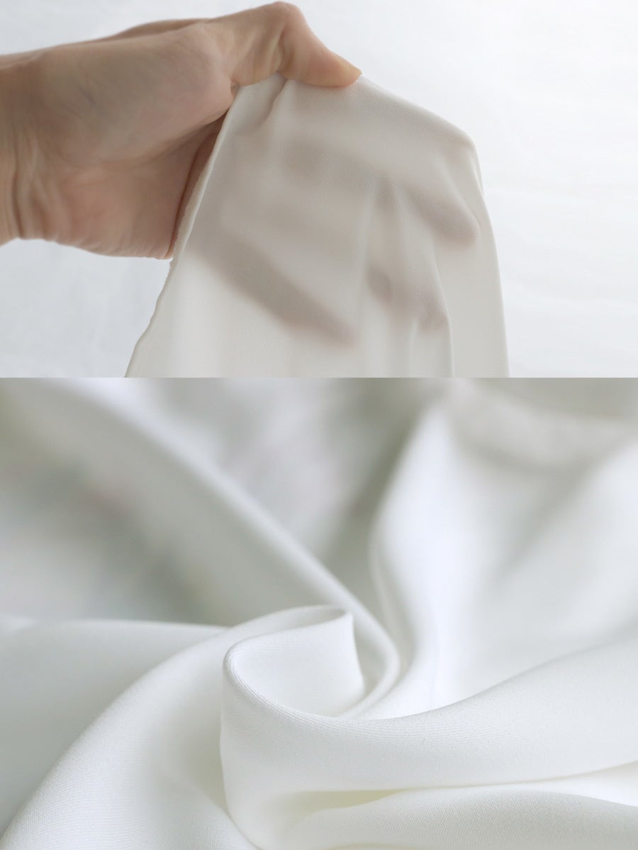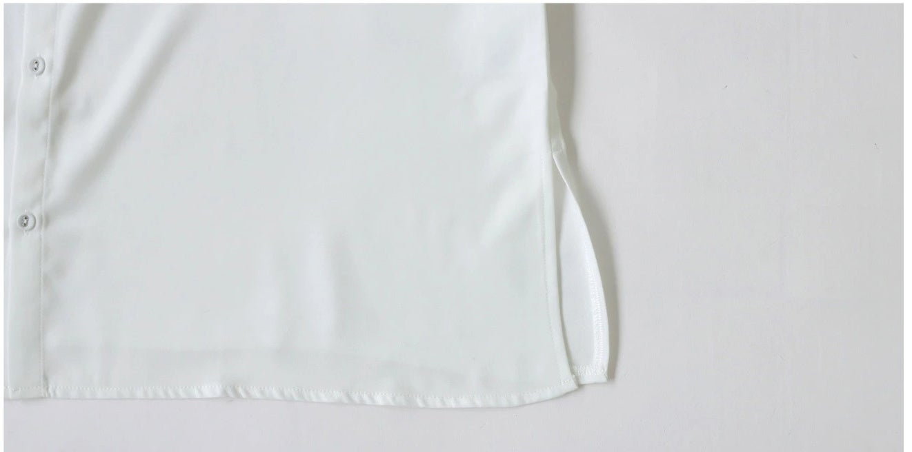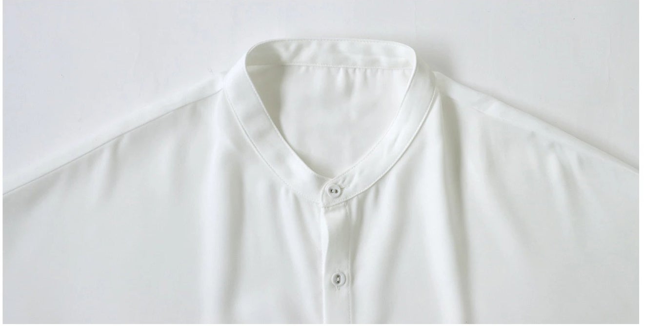 真っ白いキャンバスをイメージしたロングシャツは、スタンドカラーですっきりとした印象に。前立てとボタンは同じ色にすることで高級感も演出します。