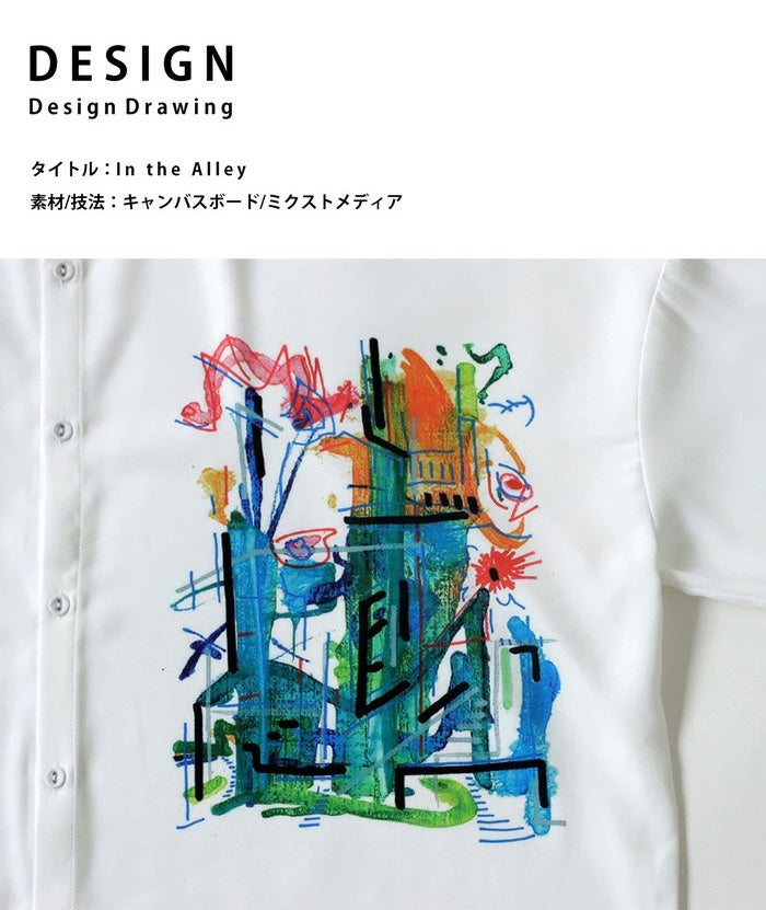 今回第一弾として登場したのは、「The art your imagination completes(あなたの想像力が完成させるアート)」をコンセプトとし、気軽に選び、身近に飾れる作品を「ライフスタイルアート」と名づけて創作活動を行っている抽象画家のヒロ・ヤタベ氏のアート作品『In the Alley』をプリントしたロングシャツです。