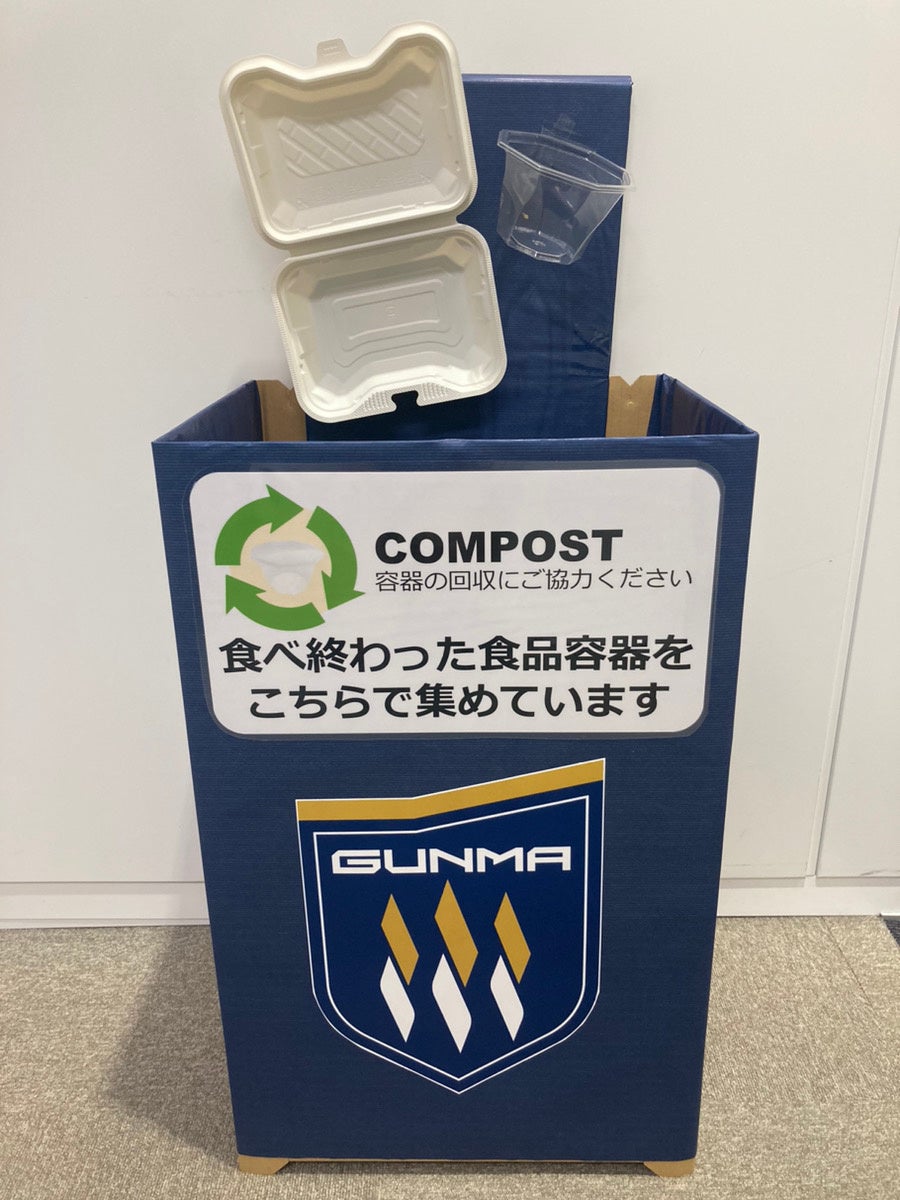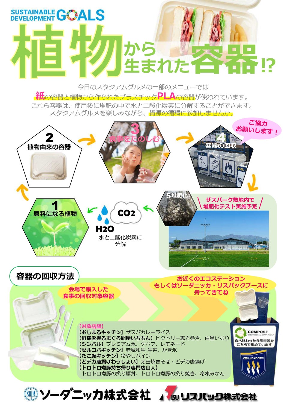 『昨年に引き続き、スタジアムグルメに紙や生分解性プラスチックの容器・カトラリーを使用頂き、回収実験を行います。今年は、エコステーションのほか、ソータニッカ・リスパック共同ブースにも回収箱を設置します。容器の回収ご協力くださった方には、ノベルティをプレゼント!