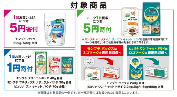 モンプチ ボックス・ピュリナ ワン キャット ドライは、店頭の専用回収箱にてマークを回収し、その枚数分を寄付対象にさせていただきます。