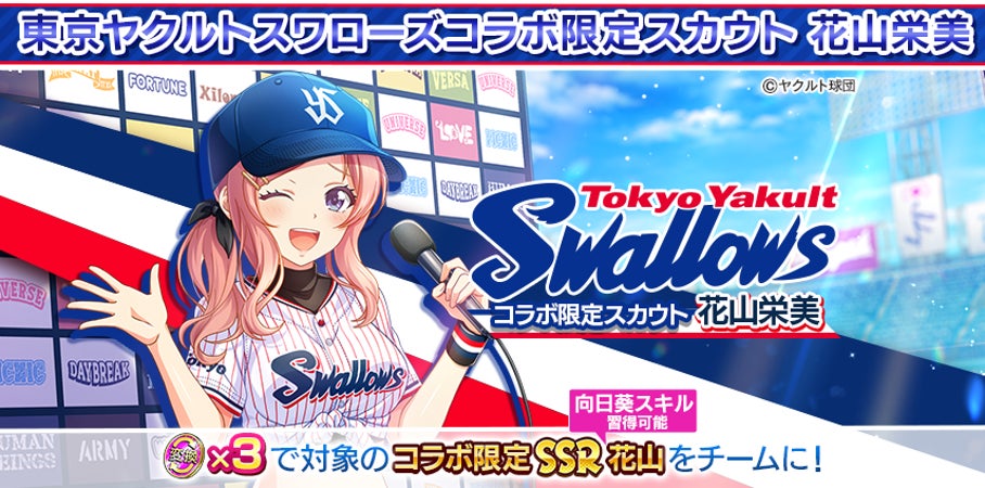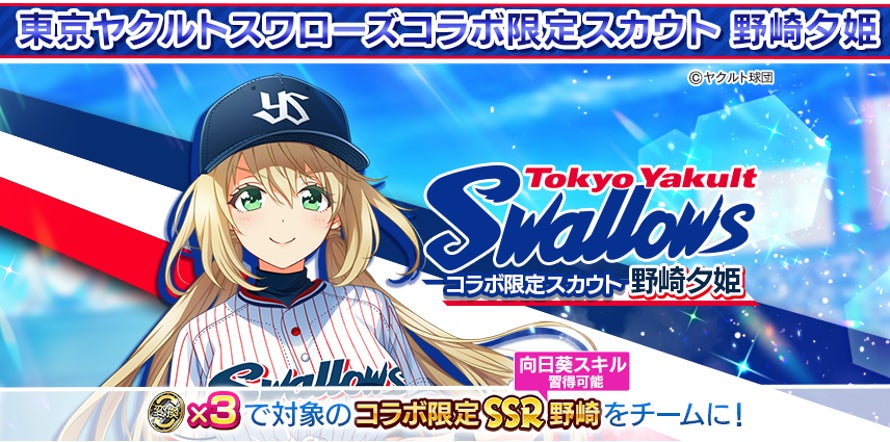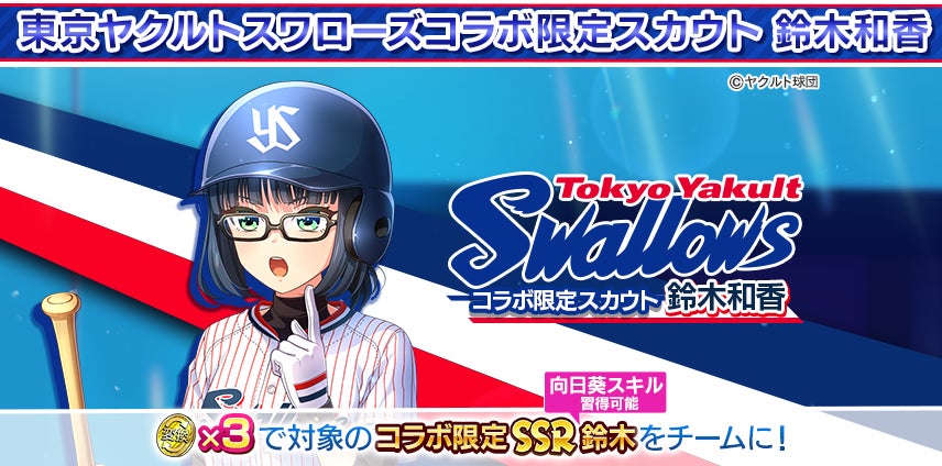 東京ヤクルトスワローズのユニフォームを着たSSR野崎夕姫(CV. 南早紀)、SSR鈴木和香(CV. 緑川優美)、SSR花山栄美(CV. 松嵜麗)が期間限定スカウトにて新登場いたします。