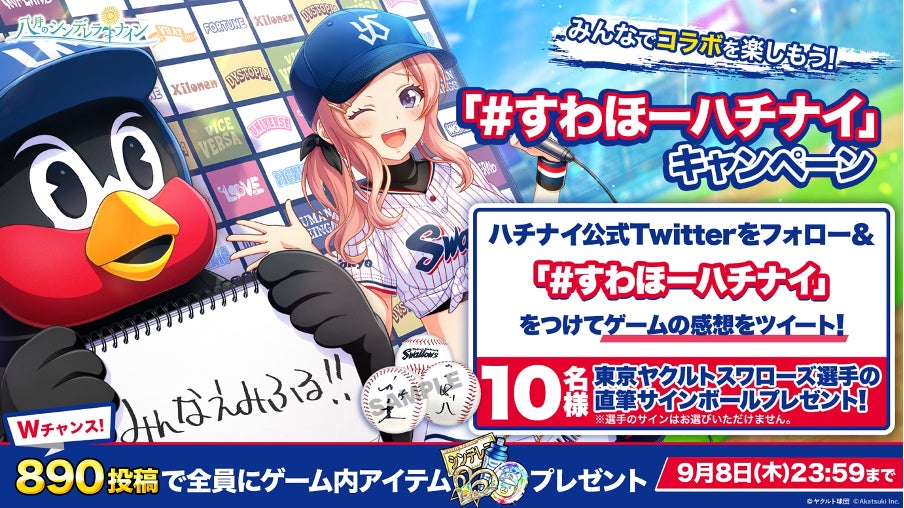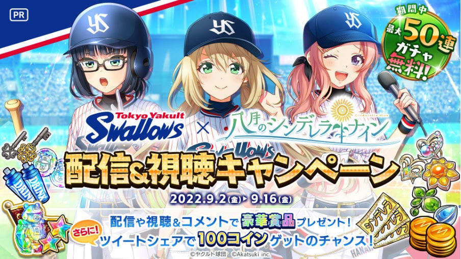 株式会社アカツキゲームス(本社:東京都品川区、代表取締役:戸塚佑貴、株式会社アカツキ100%子会社)は、当社より好評配信中のiOS/Android用アプリ『八月のシンデレラナイン(略称:ハチナイ)』において、2022年9月1日(木)よりプロ野球球団『東京ヤクルトスワローズ』とのコラボレーションが開始したことをお知らせいたします。コラボレーションを記念して、最大50連無料ガチャを始めとする5大キャンペーンを開始いたします。