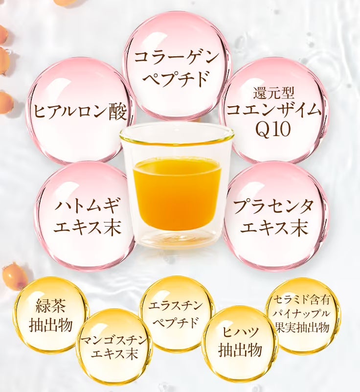 200種類以上の栄養素を含むスーパーフルーツのサジーをひと箱に約2040粒使用し、さらに10種の美容成分(コラーゲンペプチド・ヒアルロン酸・ハトムギエキス末・プラセンタエキス末・セラミド含有 パイナップル果実抽出物・還元型コエンザイムQ10・マンゴスチンエキス末・エラスチンペプチド・ヒハツ抽出物・緑茶抽出物)を惜しみなく配合しています。
