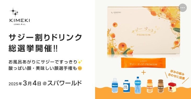 株式会社京福堂(本社:大阪府大阪市、代表取締役社長:関 崇樹)が提供するパウダー飲料『サジーすっきりPREMIUM』を展開するブランド「KIMEKI」は、2025年3月4日、スパワールド(SPAWORLD HOTEL&RESORT)にて試飲イベント「サジー割り総選挙」を開催いたしました。