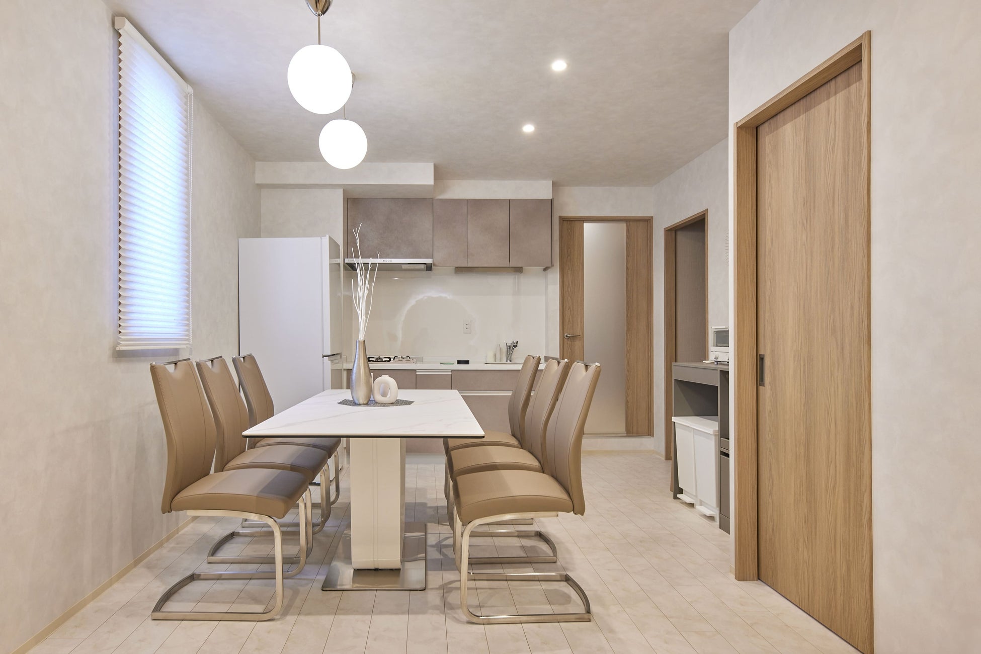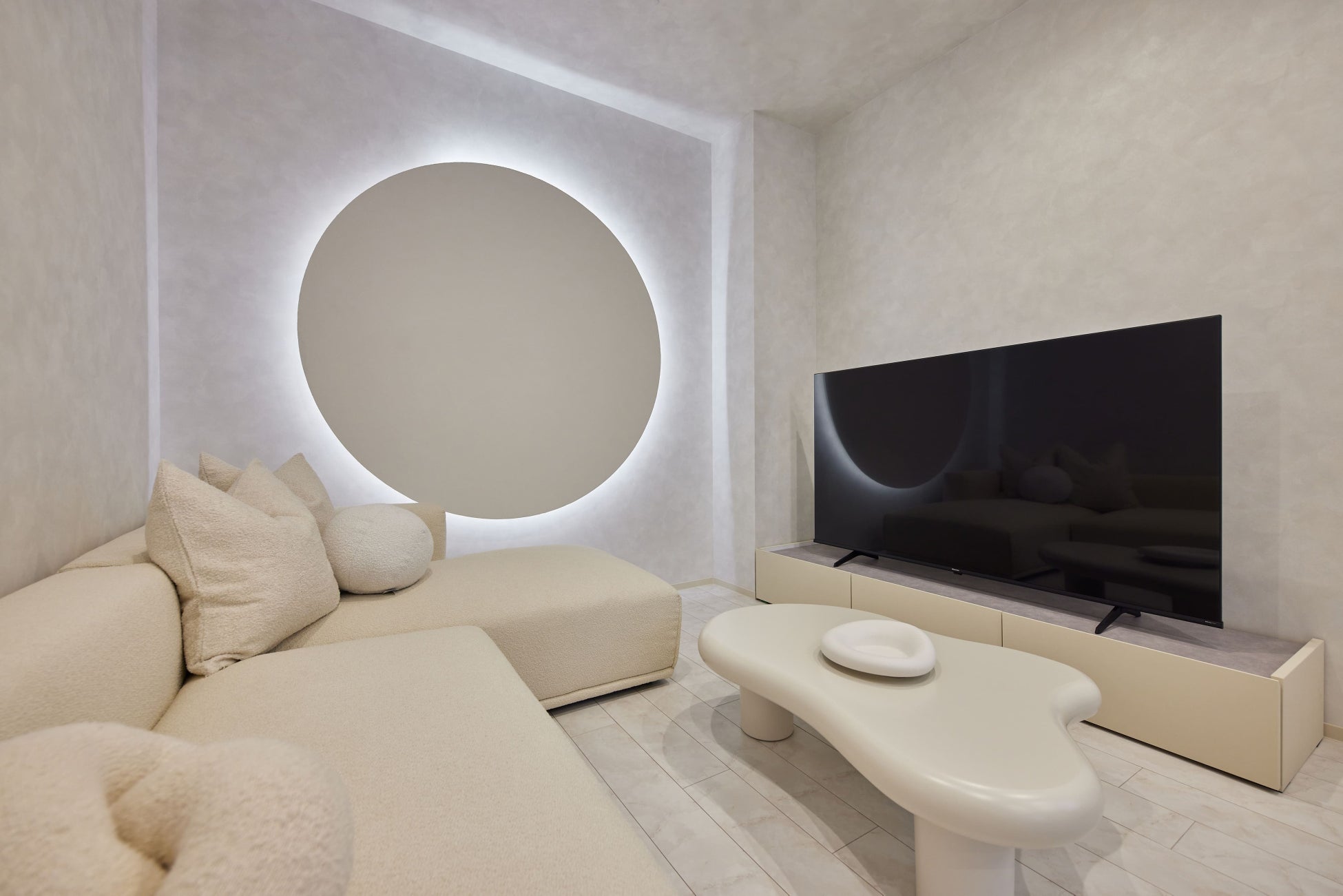 大きな特徴は、まるで非日常の空間にいるような和モダンのインテリアと、リビングの円形の関節照明です。「eni.」シリーズのコンセプトである「縁になる」を”円”という形で表現したもので、同シリーズの施設内にこの象徴は数多く登場します。今回、記念すべき自社ビル内の施設ということで、この「円」をメインであるLDKに大きく配置しています。