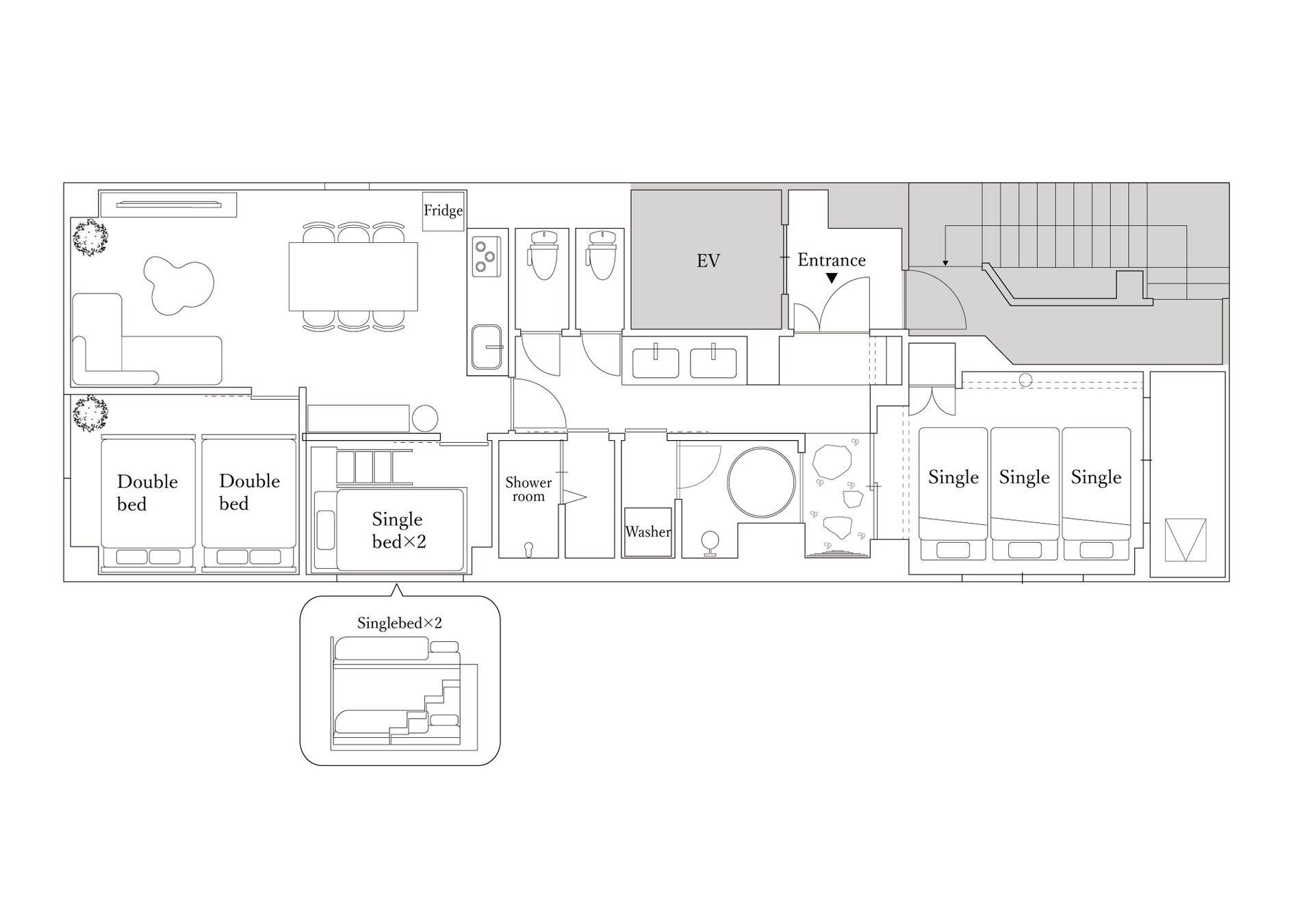 (主寝室:ダブルベッド2台 寝室:シングル2段ベッド1台 和室:布団3組)