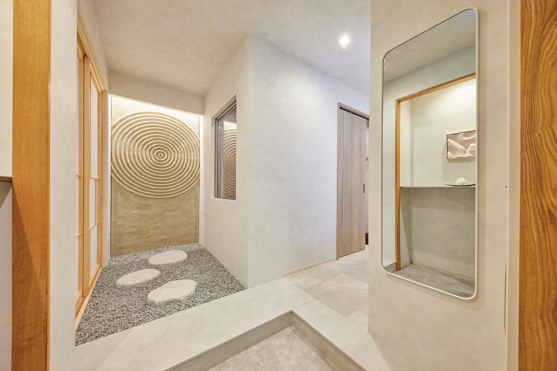 玄関正面にはLDKと同じく、「円」を象徴するデザインを配置。右手の窓は先程の浴室のものであり、湯舟につかりながらこの和の空間を楽しんでいただける仕様になっています。