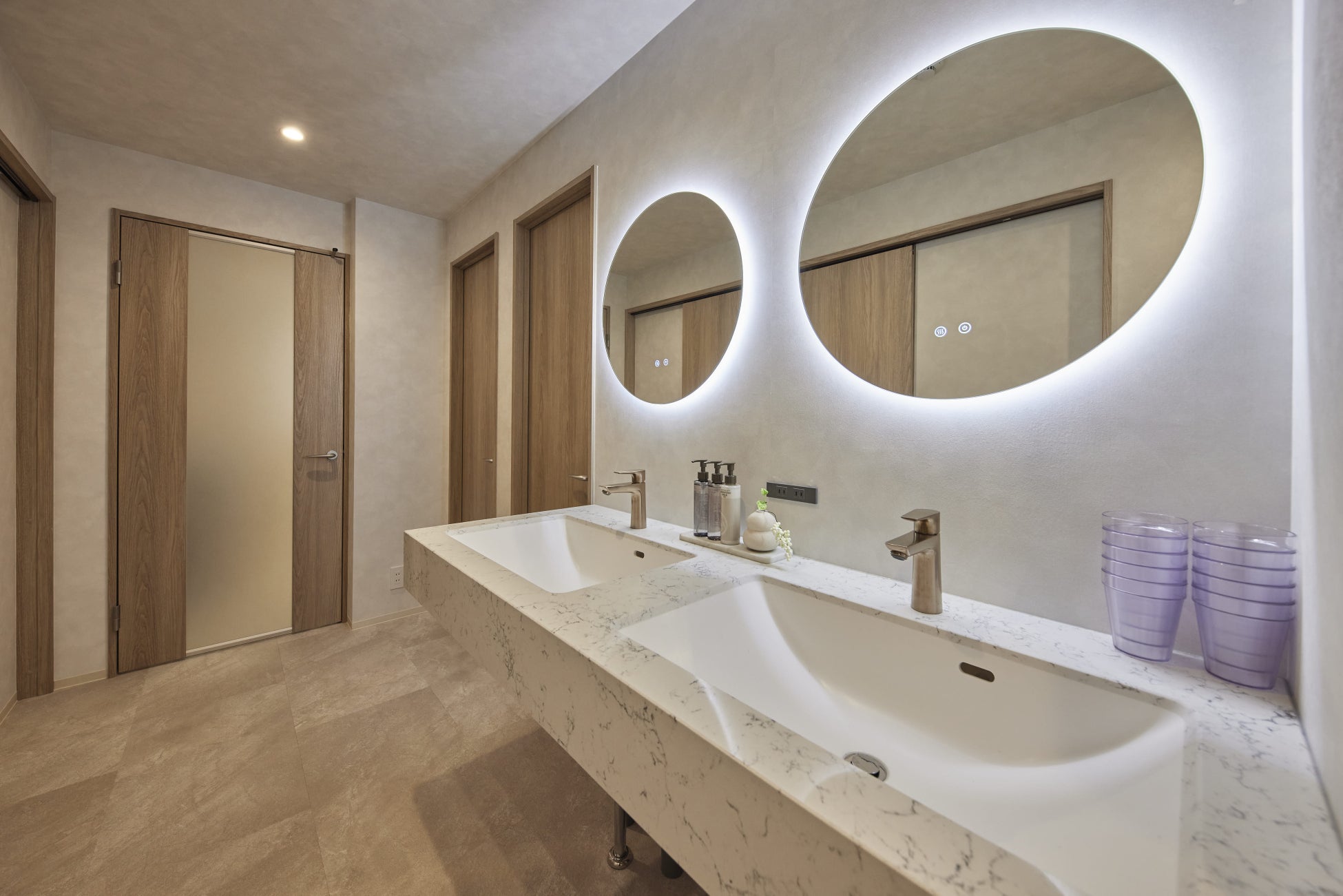 ホールにはダブルボウルの洗面を設置。大理石調の白いカウンターが空間に清潔感を与えます。