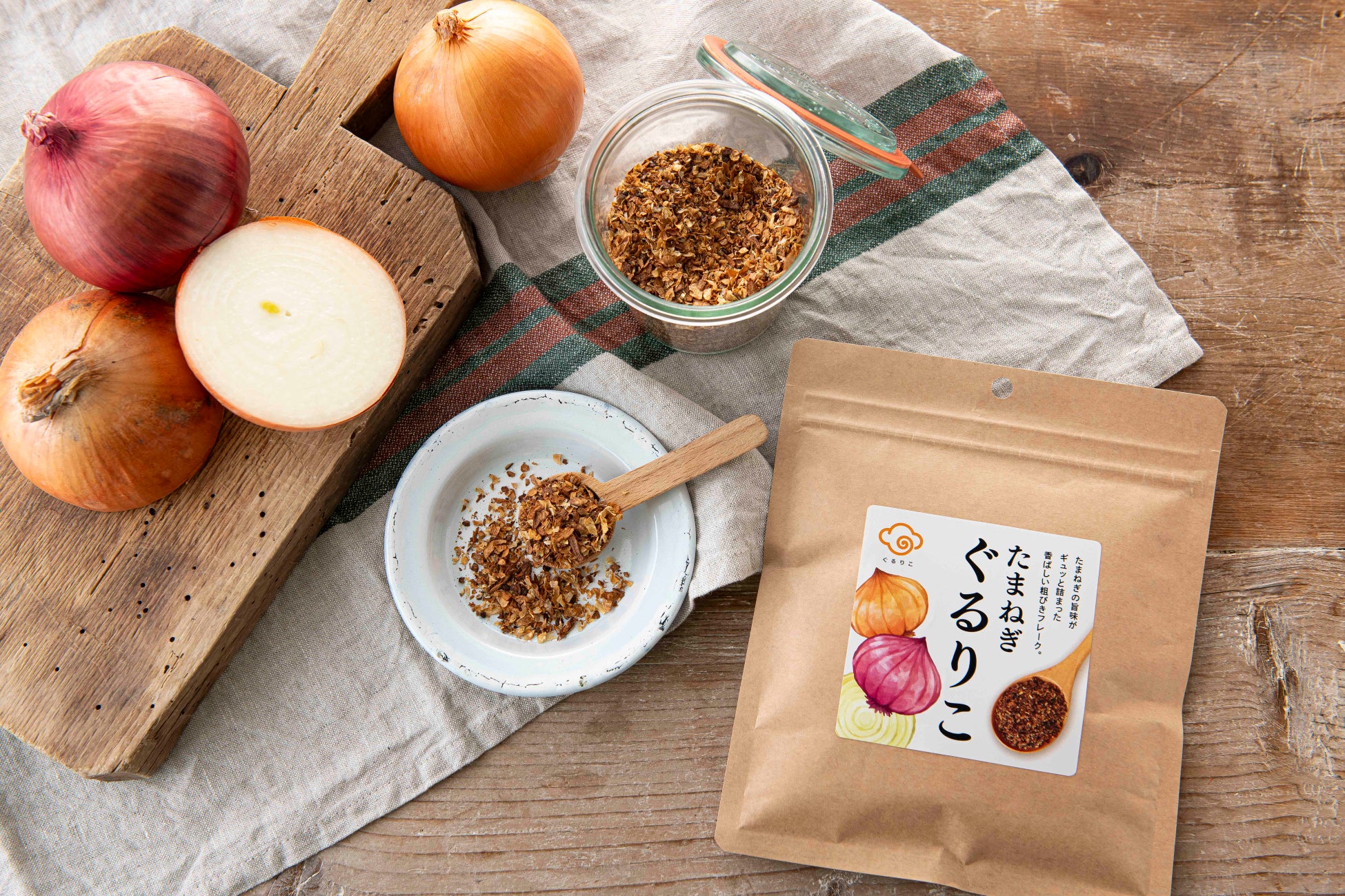『タマネギぐるりこ®』は、タマネギの芯、表面の硬い部分、スライス時のサイズの規格外品が原料となっており、100%タマネギ由来の乾燥玉ねぎフレークです。原料となっている玉ねぎの端材は、吉野家ホールディングスの野菜加工センターで牛丼用の玉ねぎを下処理する際に発生したものになっており、おいしくエシカルなアップサイクルフードです。