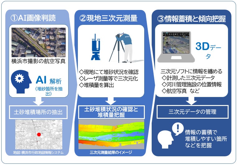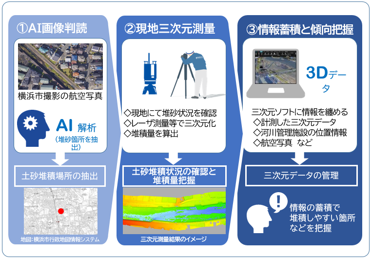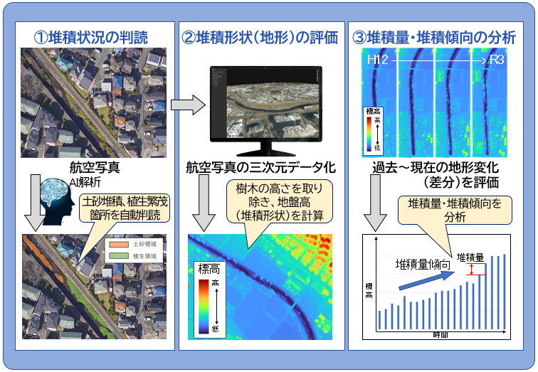 航空写真のAI画像判読から堆積場所を抽出し、レーザ測量等により三次元モデルを作成し、堆積量の把握、堆積傾向の把握手法を実証します。