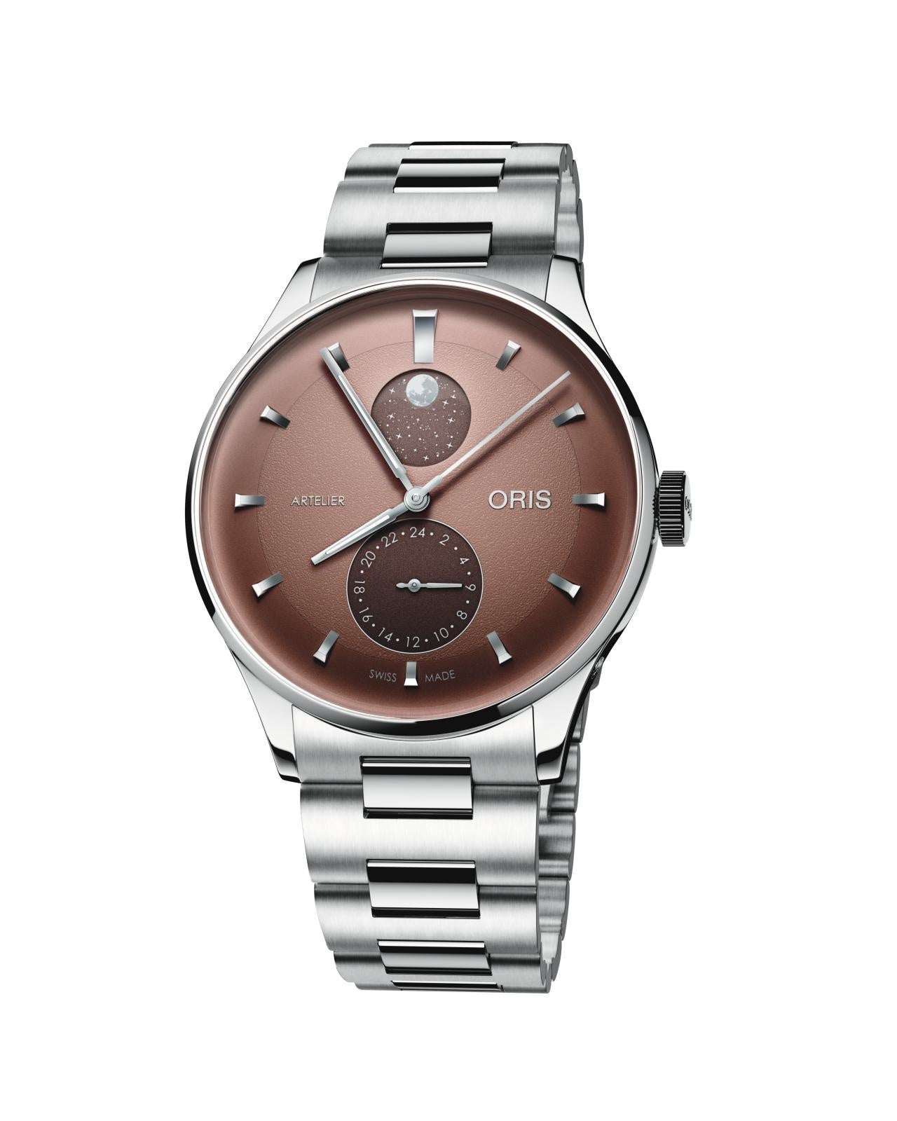 39.5mmのステンレススティールケースに、新開発の自動巻きムーブメント「オリス キャリバー782」を搭載。12時位置にムーンフェイズ、6時位置に第2時間帯表示を配し、従来モデルから表示を整理することで視認性と操作性を向上させました。ドーム型サファイアガラスや立体的なインデックスが、落ち着きのある表情を演出。アイボリー、ミッドナイトブルー、チェスナットの3色展開で、現代的なドレスウォッチとしての完成度を高めています。