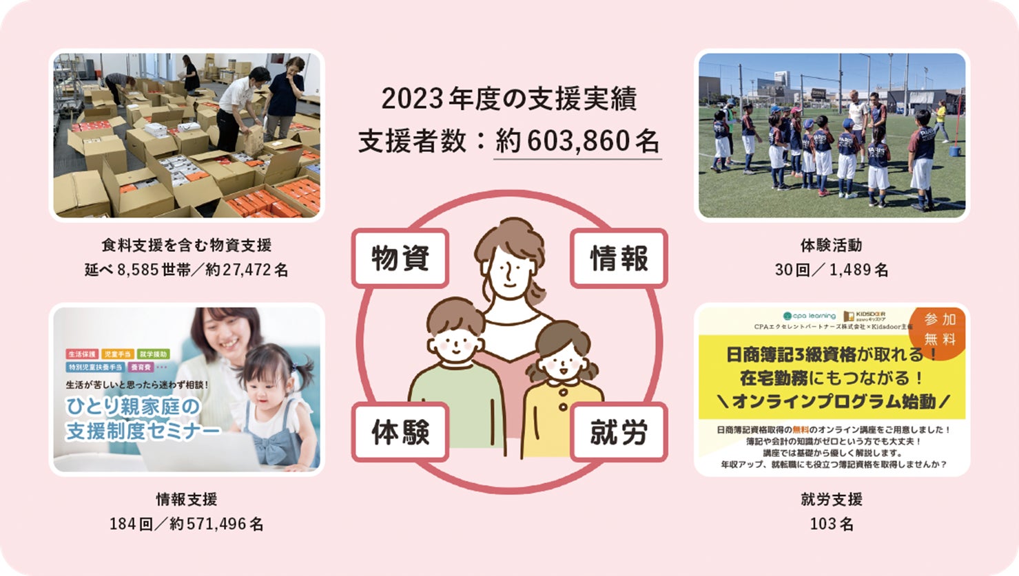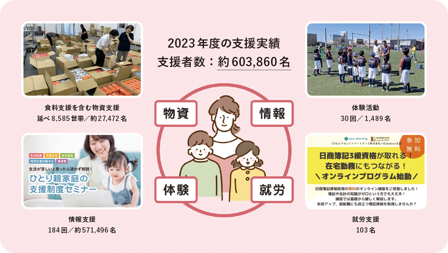 キッズドアのファミリーサポートは、民間の個人・法人から様々なご支援をいただき、子育て家庭を支える物資・情報・体験・就労支援を届けています。