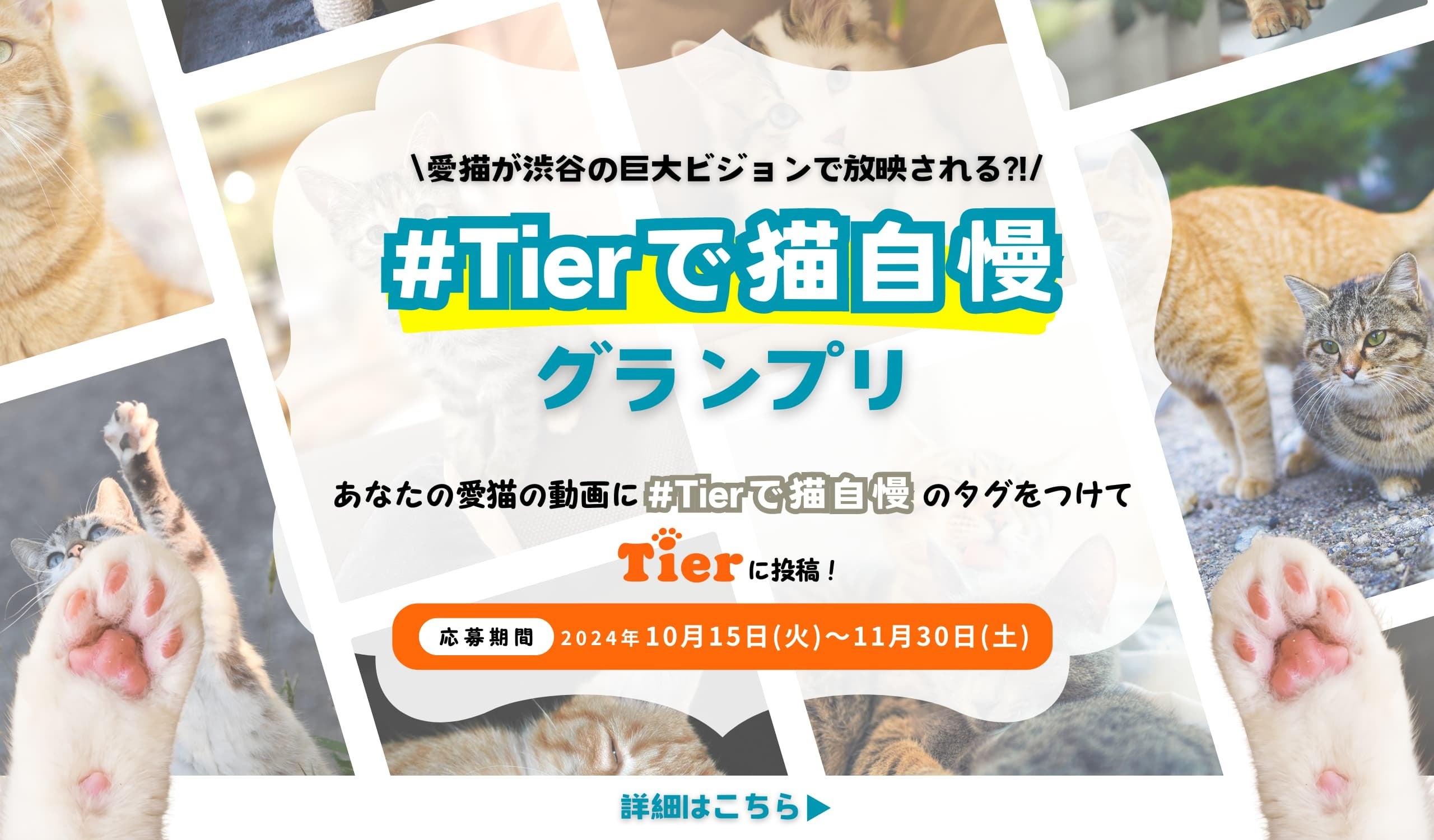 #Tierで猫自慢 のハッシュタグをつけた動画をTierアプリ内で投稿していただき、見事グランプリに輝いた動画は、1月1日(水)より1ヶ月間、渋谷愛ビジョンにて放映させていただきます。